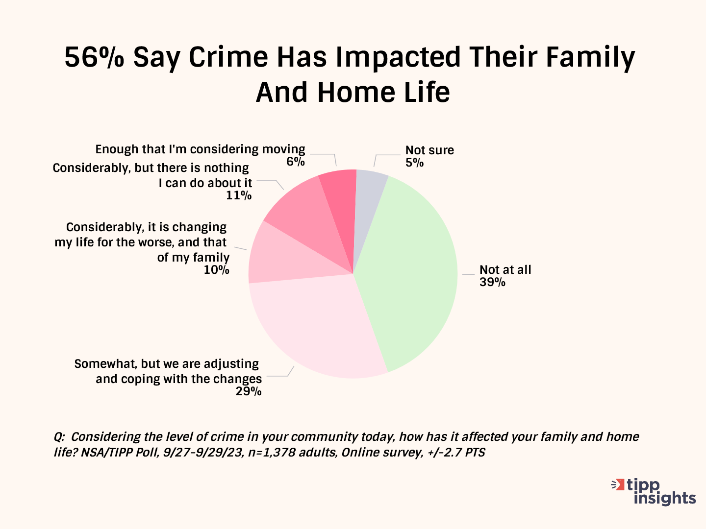 Increased crime has a considerable impact on one in five (21%) American families, with 11% adopting a resigned attitude that there is nothing they can do about it. Another 29% say that it has somewhat of an impact and are coping with the changes. The impact has been particularly hard on six percent of respondents considering moving from their current neighborhoods. They add up to 56% and make up the majority.
