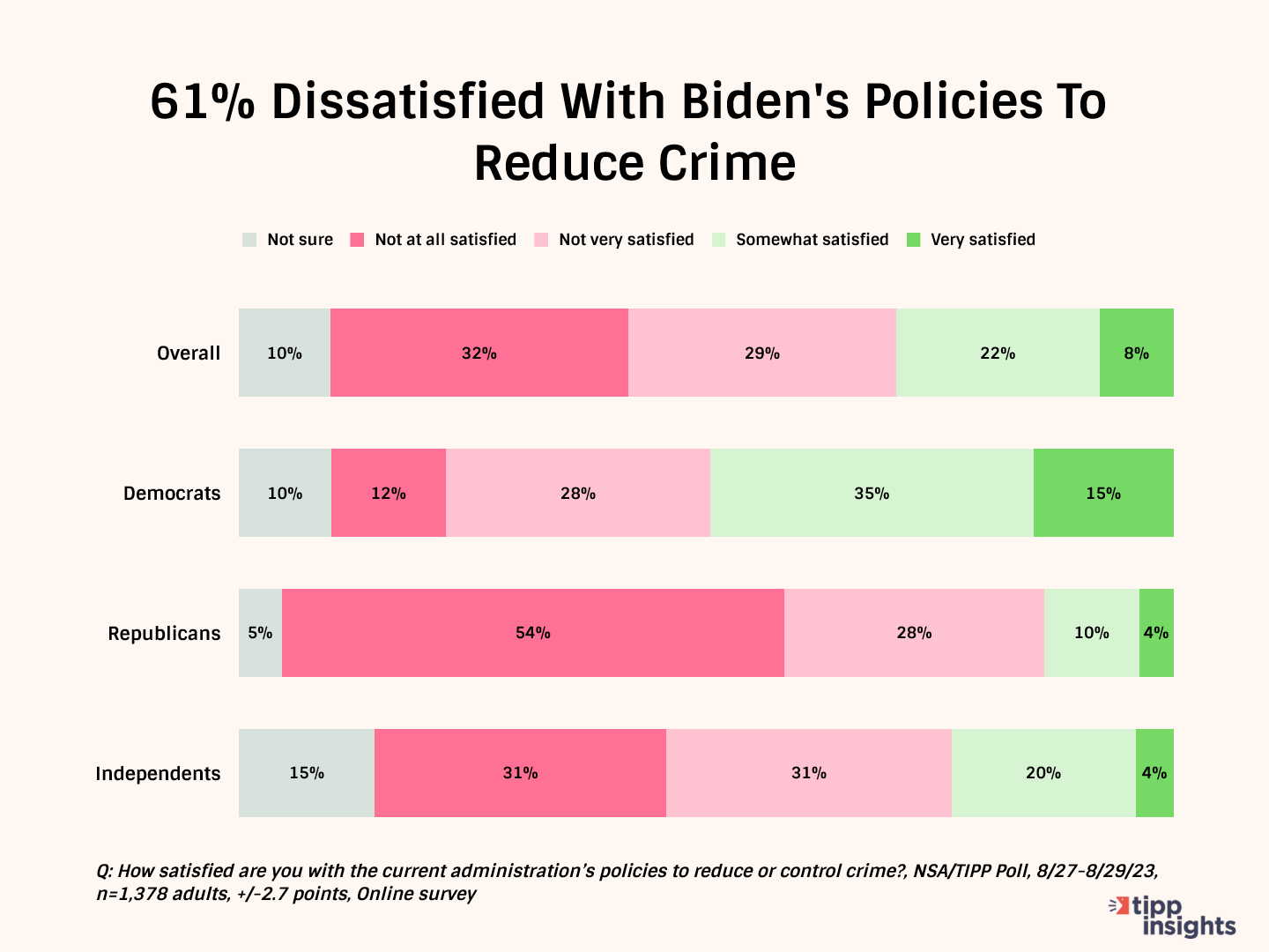 Six in ten (61%) Americans are dissatisfied with Biden's policies to reduce or control crime, with 32% expressing no satisfaction at all and another 29% expressing very little satisfaction.