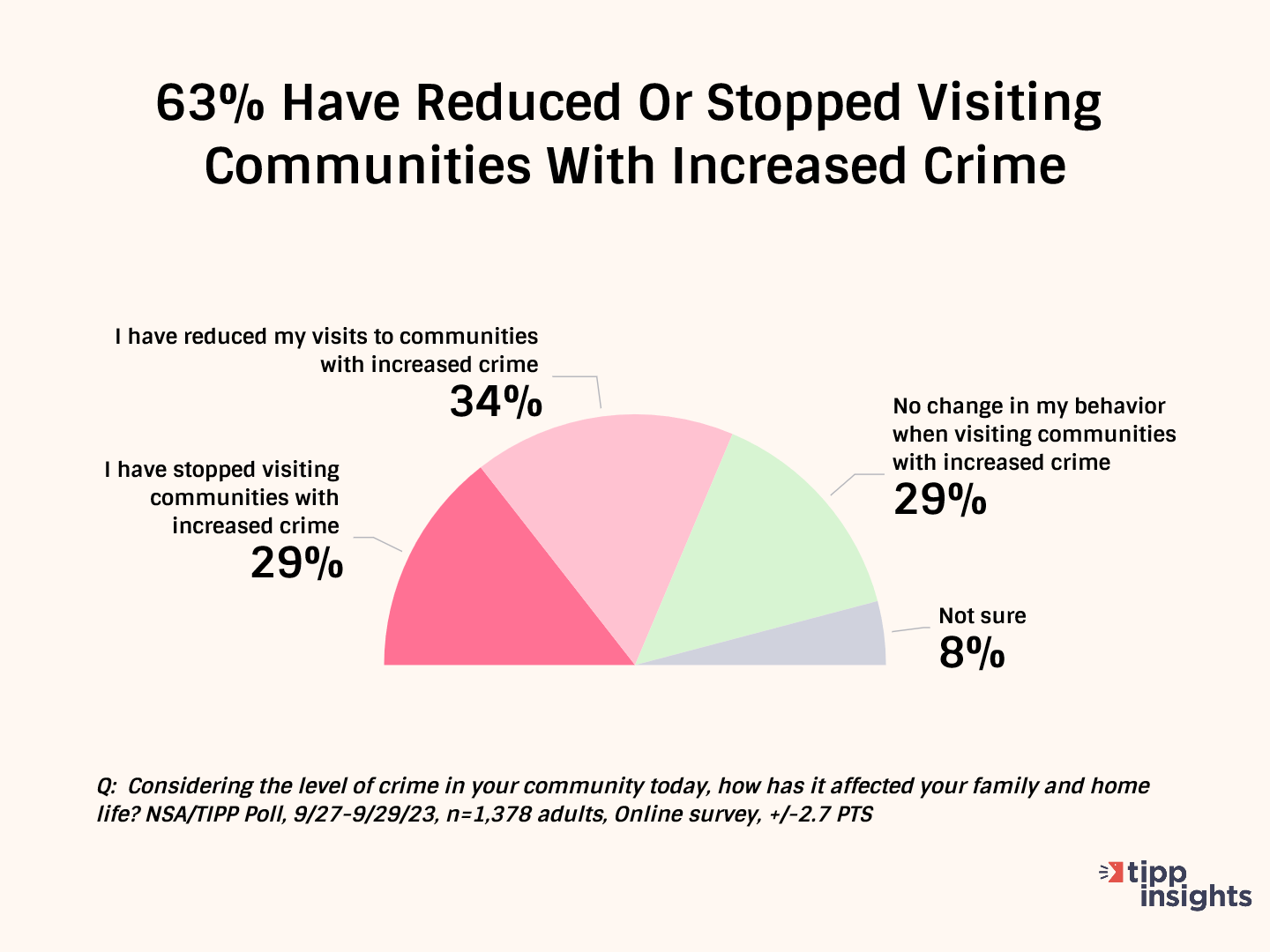 Communities with increased crime are being abandoned. For example, nearly two-thirds (63%) of respondents have reduced or stopped visiting communities with increased crime. While a third (34%) have reduced, another 29% have stopped altogether.