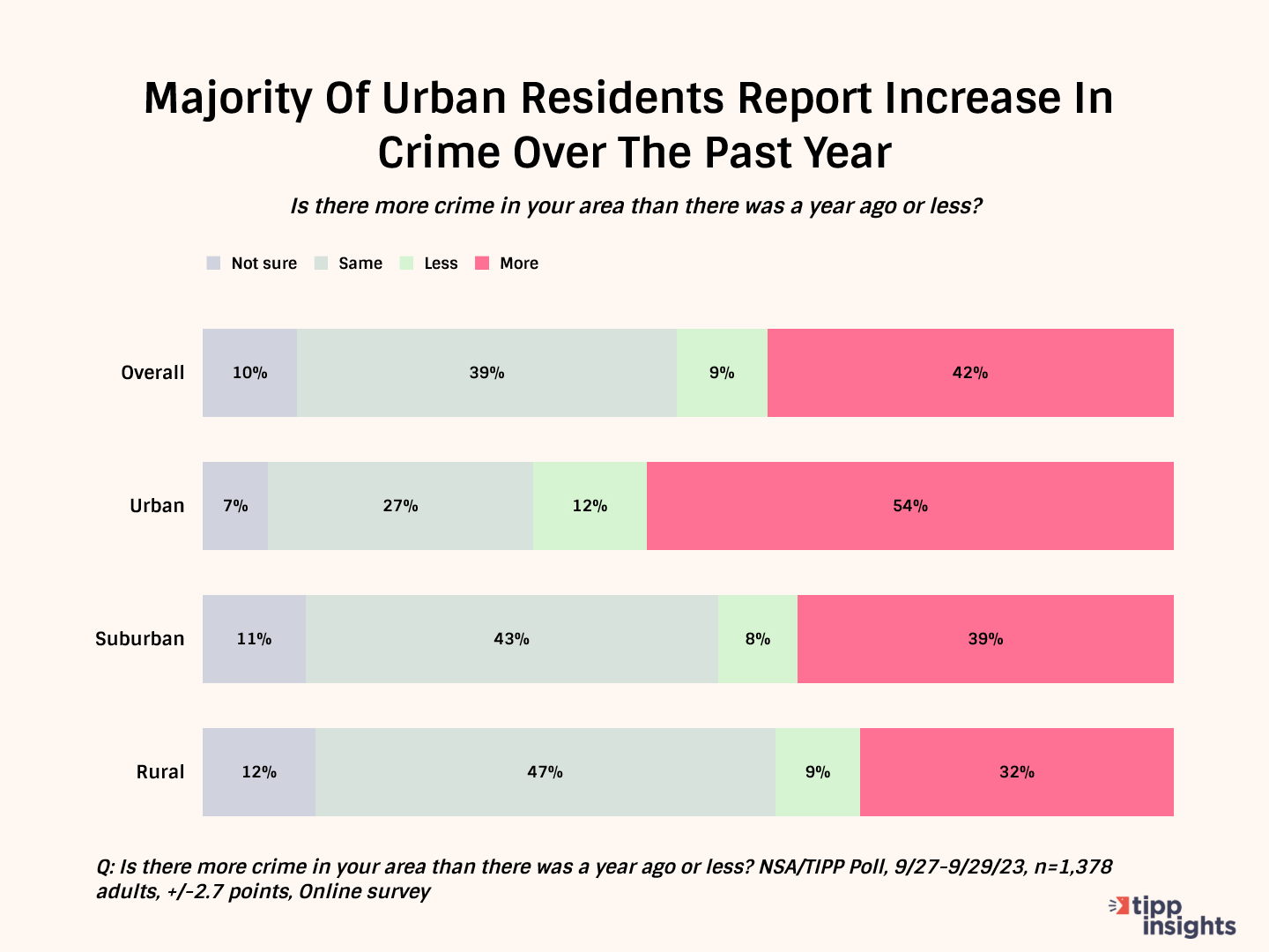 Interestingly, a majority of urban dwellers (54%) report an increase in crime compared to only a third (32%) of rural Americans. Four in ten (39%) suburban residents state that crime has increased in the past year.