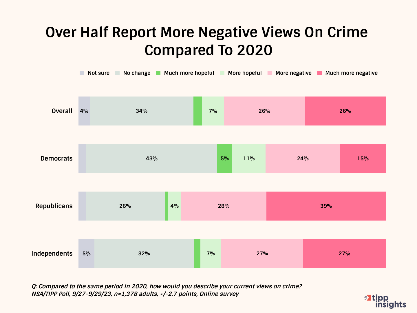 Over half (52%) say that their current views on crime are more negative than at the same time in 2020 during the pandemic. However, a third (34%) state that their views have not changed. Only a handful (10%) say that they are now more hopeful than before.