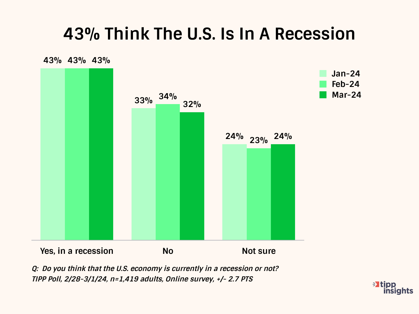 Four in ten (43%) Americans believe we are in a recession, while 24% are unsure. 32% believe we are not in a recession. Interestingly, the share of Americans who feel we are in a recession has stayed at 43% since January.