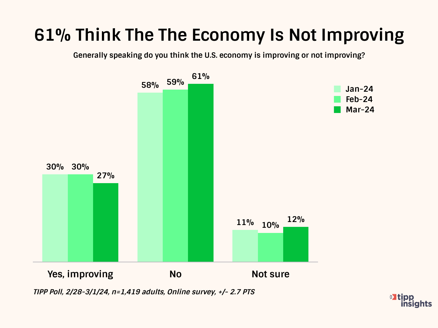 Further, over one-half (61%) think the U.S. economy is not improving, while 27% believe it is improving.