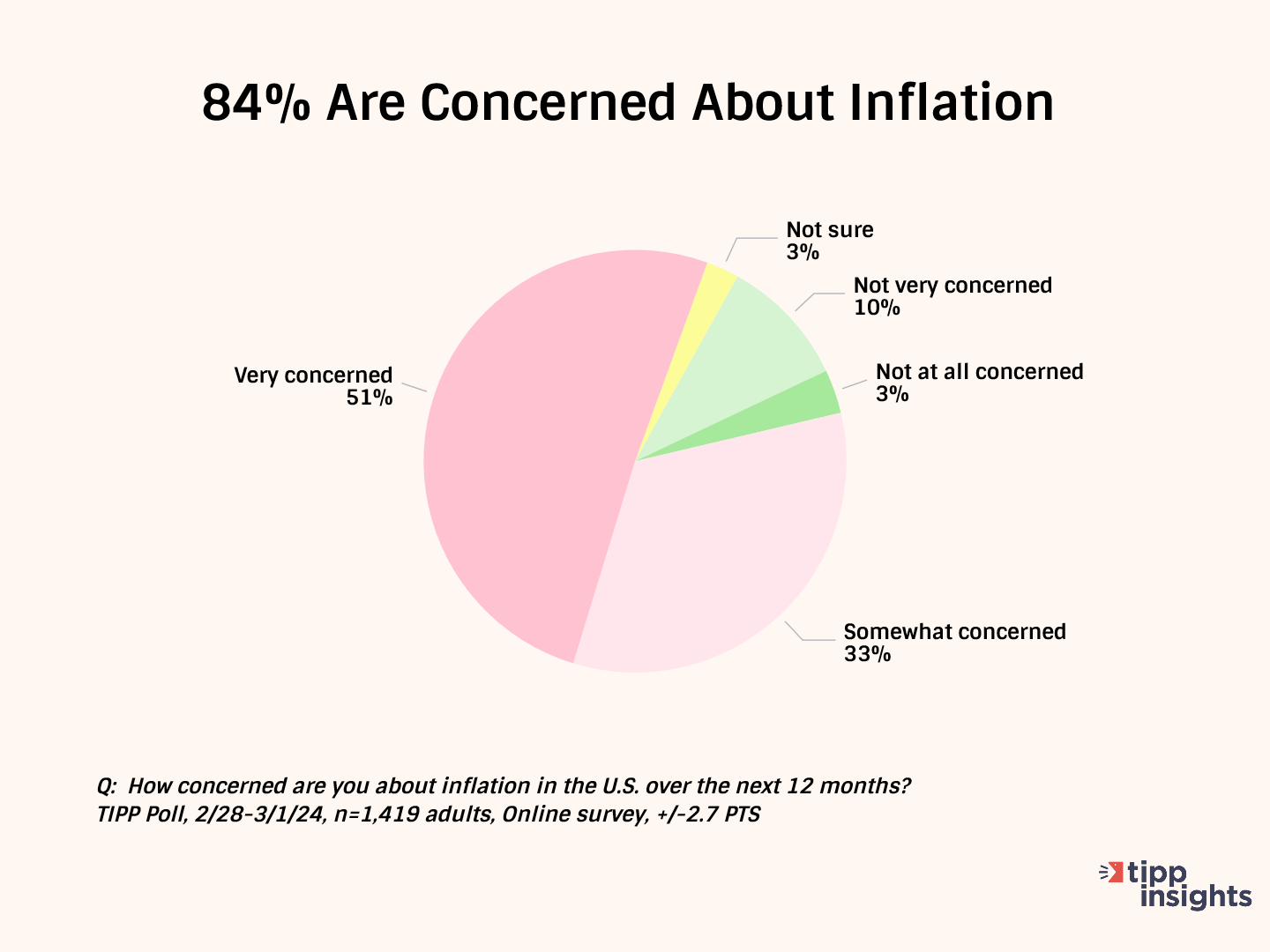 Inflation acts as a form of indirect tax on American households. According to a recent TIPP survey, 84% are worried about inflation. One-half (51%) are very concerned, and another 33% are somewhat concerned.