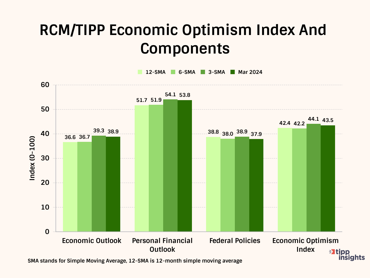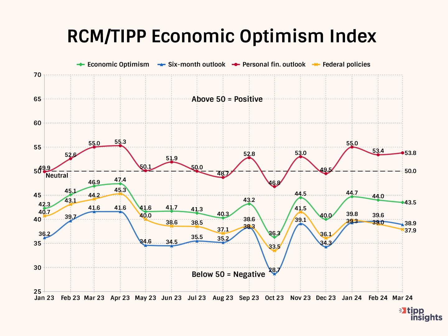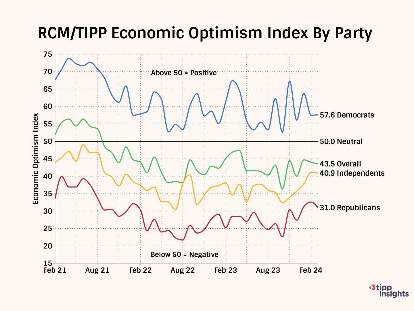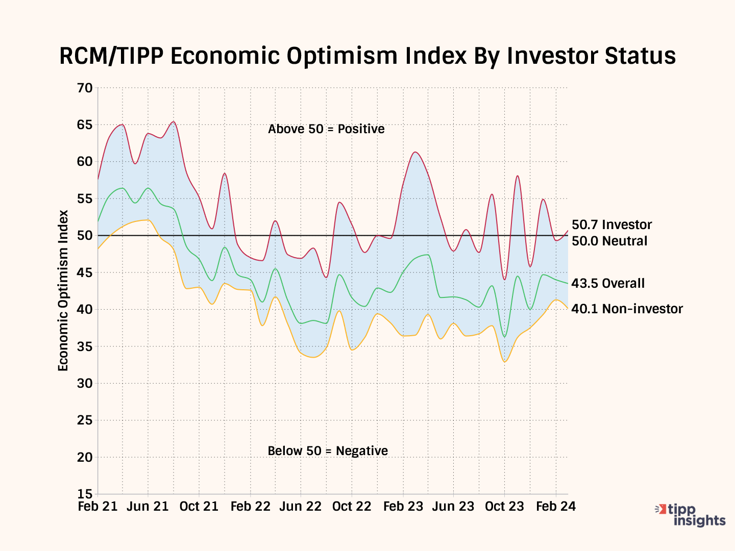 The RCM/TIPP Economic Optimism Index has three key components. For the index and its components, a reading above 50.0 signals optimism, and a reading below 50.0 indicates pessimism.