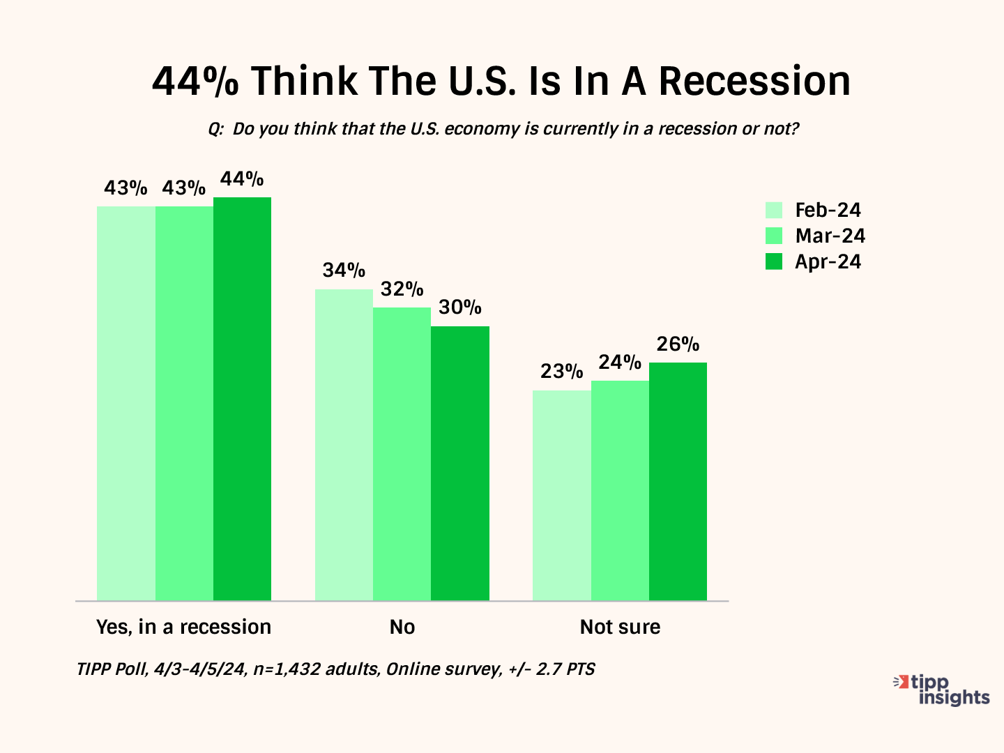Four in ten (44%) Americans believe we are in a recession, while 26% are unsure. 30% believe we are not in a recession.