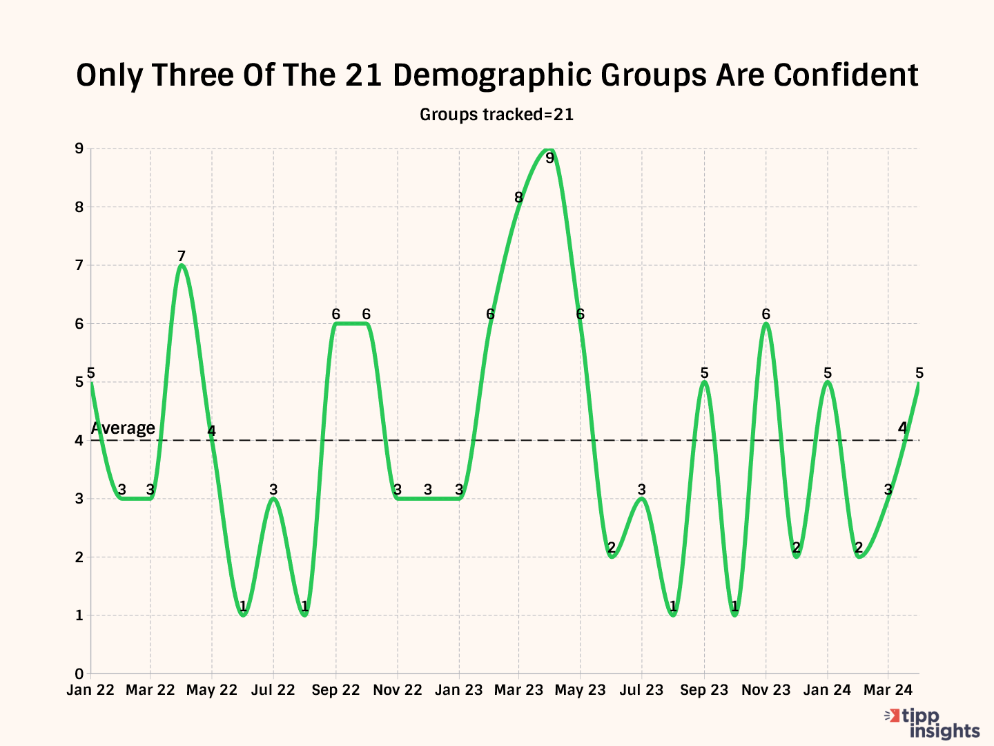 The number of groups in the positive zone indicates the breadth of optimism in American society. This month, three of the 21 demographic groups we track—such as age, income, education, race, etc.—are above 50.0, indicating optimism on the Economic Optimism Index. Starting with three groups in January 2023, we saw steady improvement, peaking at nine groups in April and then declining to one group in August. Since August, it has been in the range of one to six. In April, only five groups are in the positive zone.