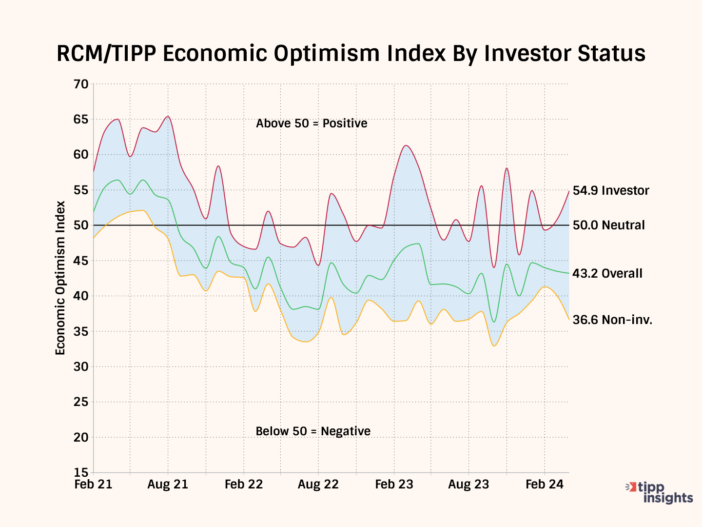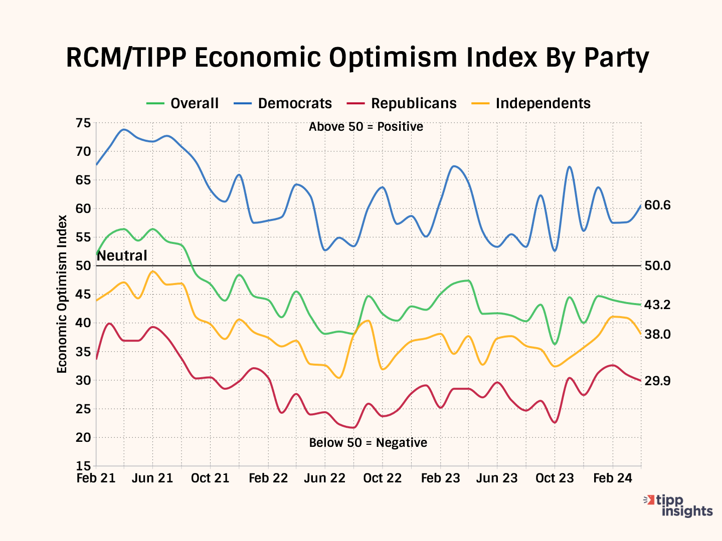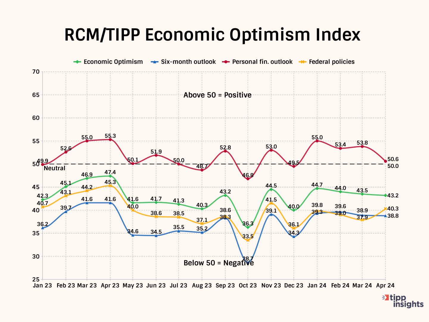 The RCM/TIPP Economic Optimism Index is the first monthly measure of consumer confidence. It has established a strong track record of foreshadowing the confidence indicators issued later each month by the University of Michigan and The Conference Board. From February 2001 to October 2023, TIPP released this index monthly in collaboration with its former sponsor and media partner, Investor's Business Daily.