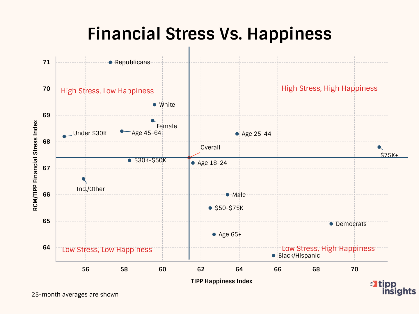 To better understand the relationship between financial stress and happiness, we plotted the RCM/TIPP Financial Stress Index and the TIPP Happiness Index for selected demographic groups. We divided the data into four quadrants using the overall index values for the Financial Stress Index and Happiness Index.