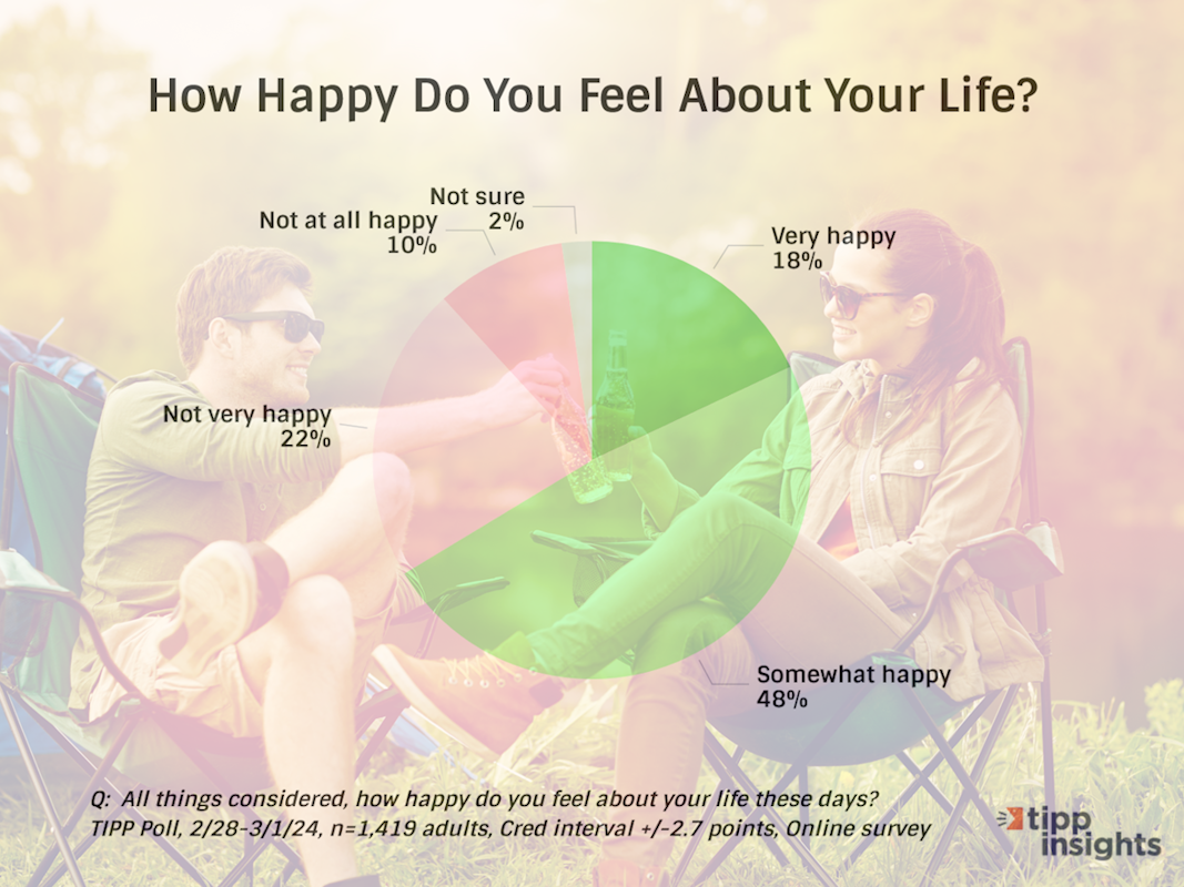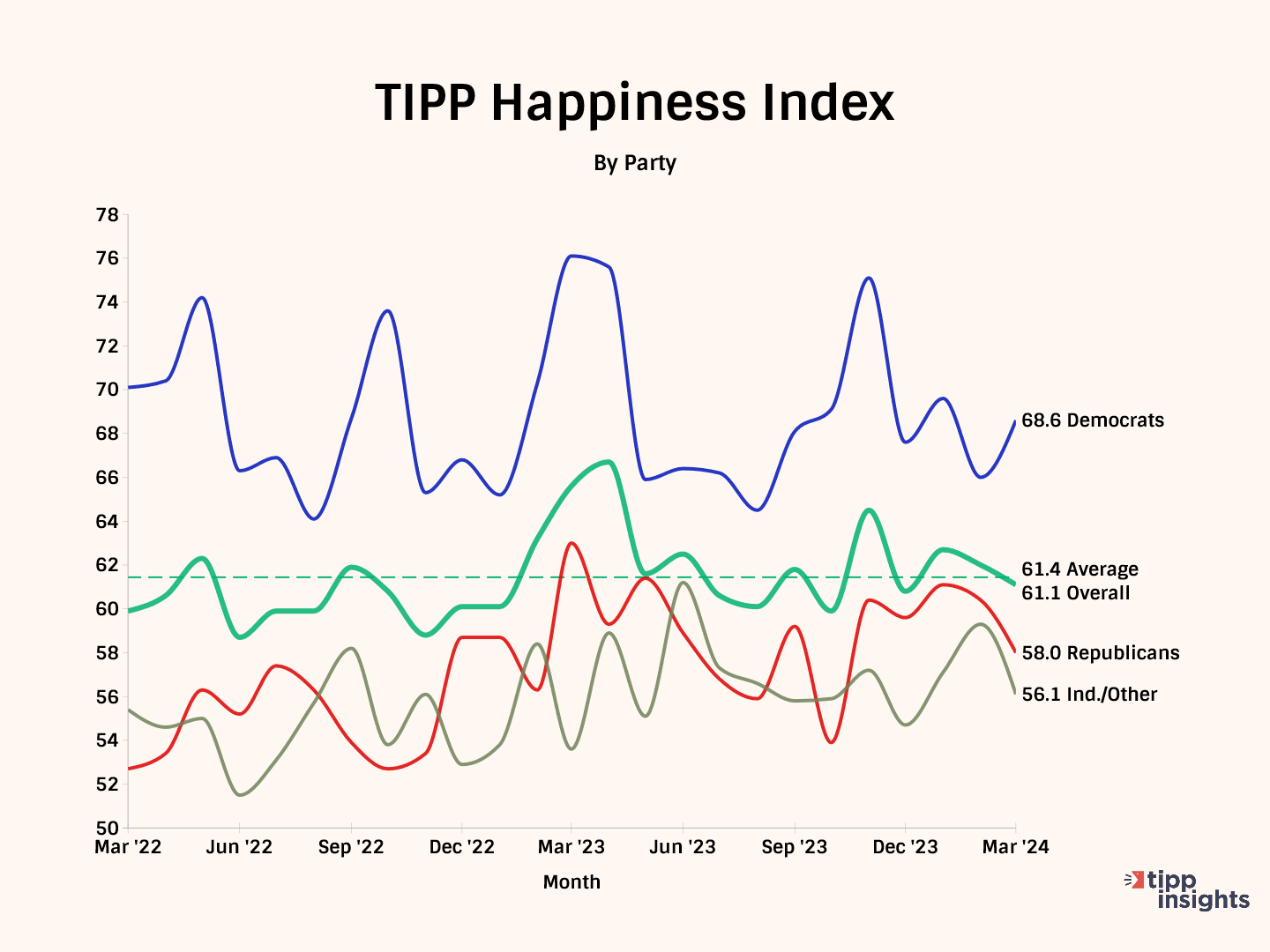 This month, the TIPP Happiness Index posted 61.1, with Democrats (68.6) scoring the highest, followed by Republicans (58.0) and independents (56.1)