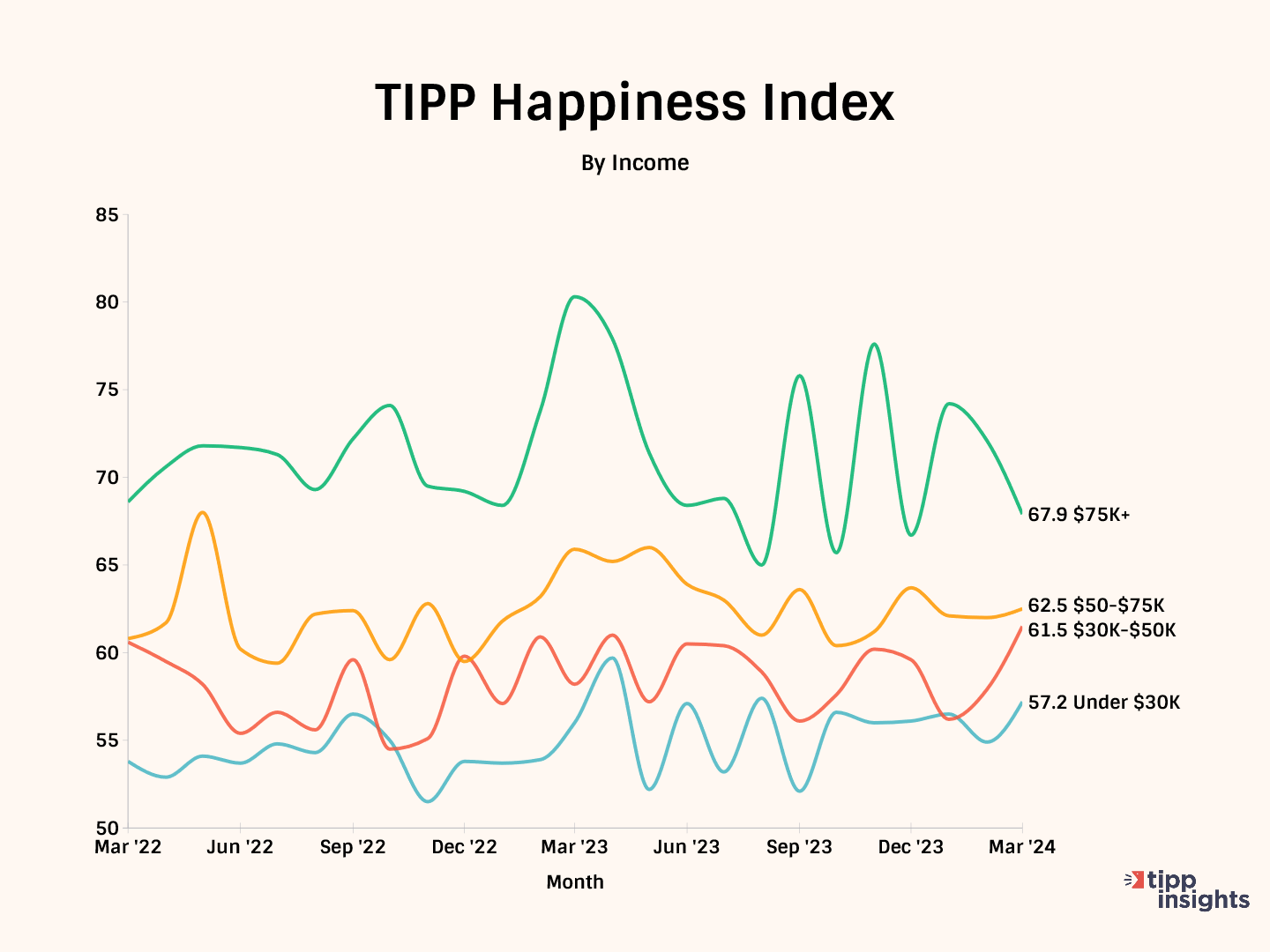 Our data shows that happiness increases with income. The green line on the chart represents the $75K+ income group, which is consistently above the next income strata of $50K-$75K. Further, the $50-$75K group shows higher happiness than the $30K-$50K group. The under $30K group registered the lowest score almost throughout the period.