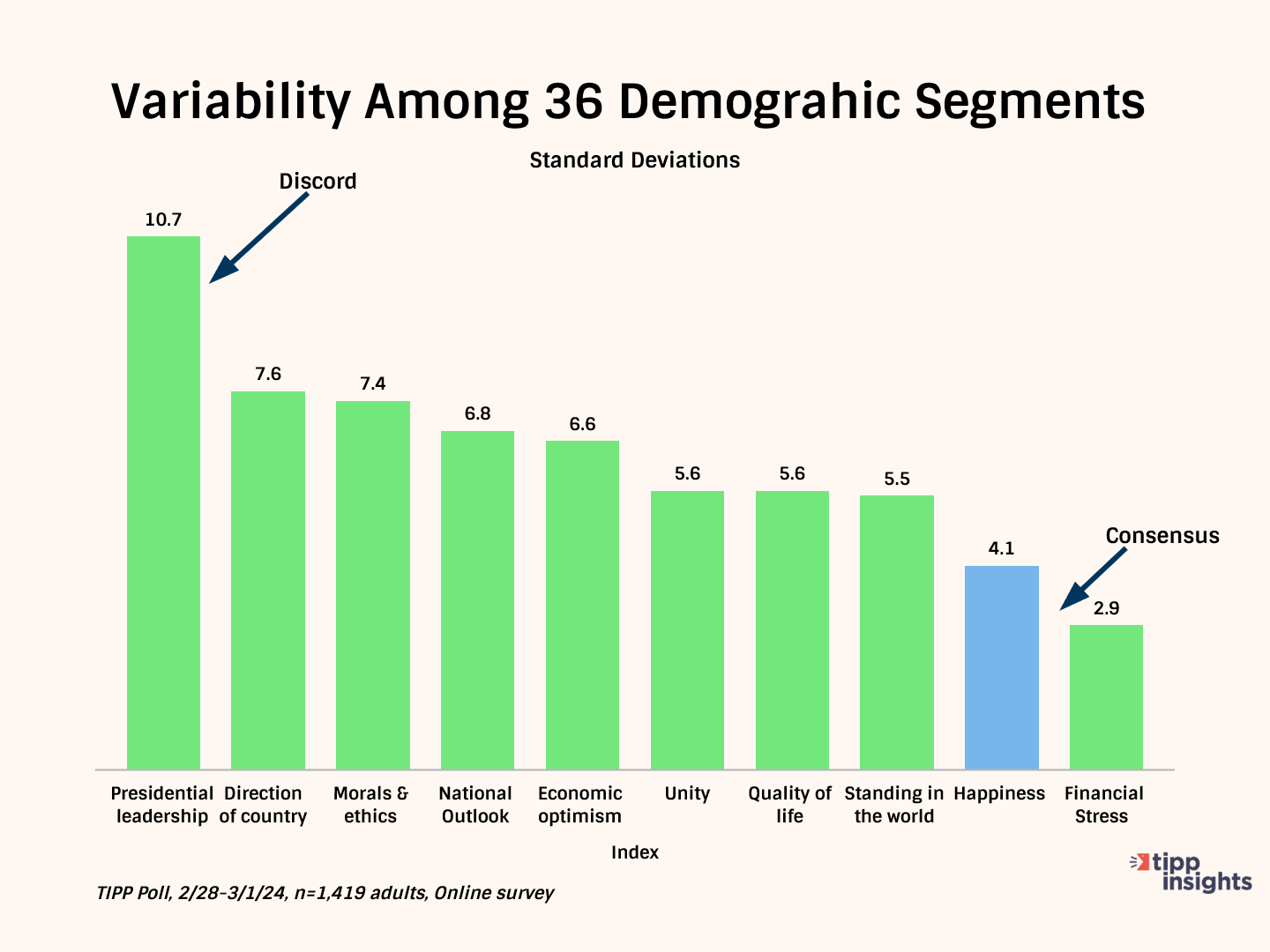 The chart below shows that financial stress and happiness exhibit the least variation, meaning better consensus among the 36 groups. The presidential leadership index and the country's direction exhibit the greatest variation, meaning a lack of consensus among the 36 groups.