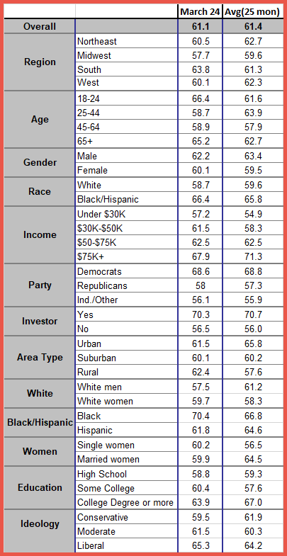 All 36 demographic groups we track are above 50 in March, indicating happiness.