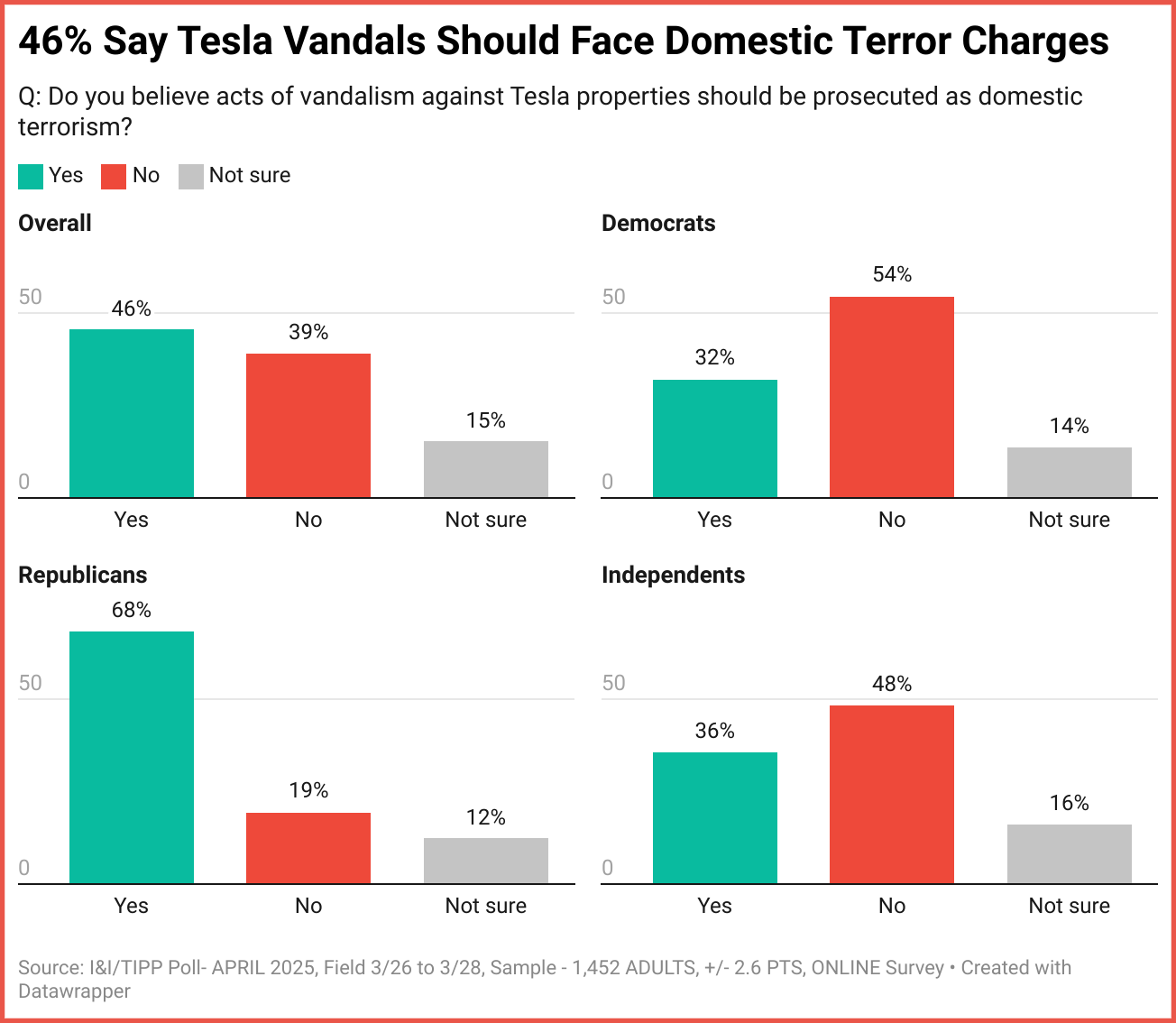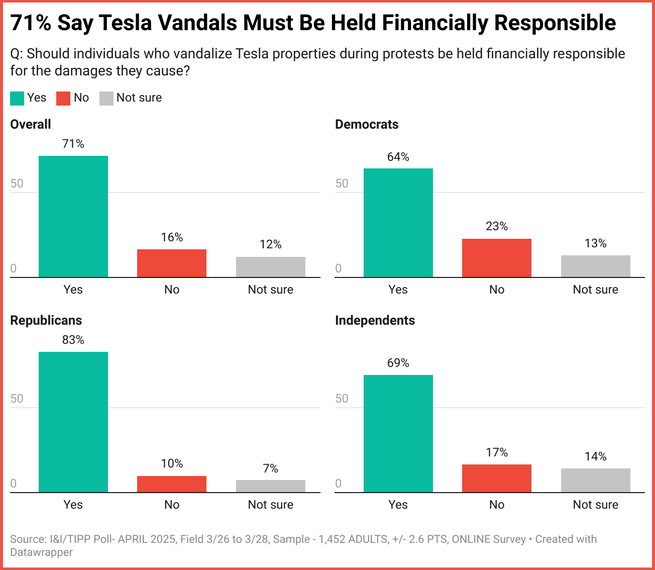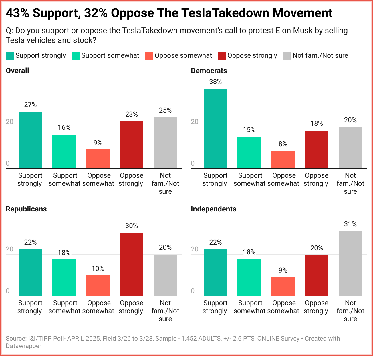The national online I&I/TIPP poll was taken by 1,452 adults from March 26 to March 28. It has a margin of error of +/-2.6 percentage points. The poll was intended to look at the anti-Musk phenomenon, and how average people view anti-Musk protesters.
