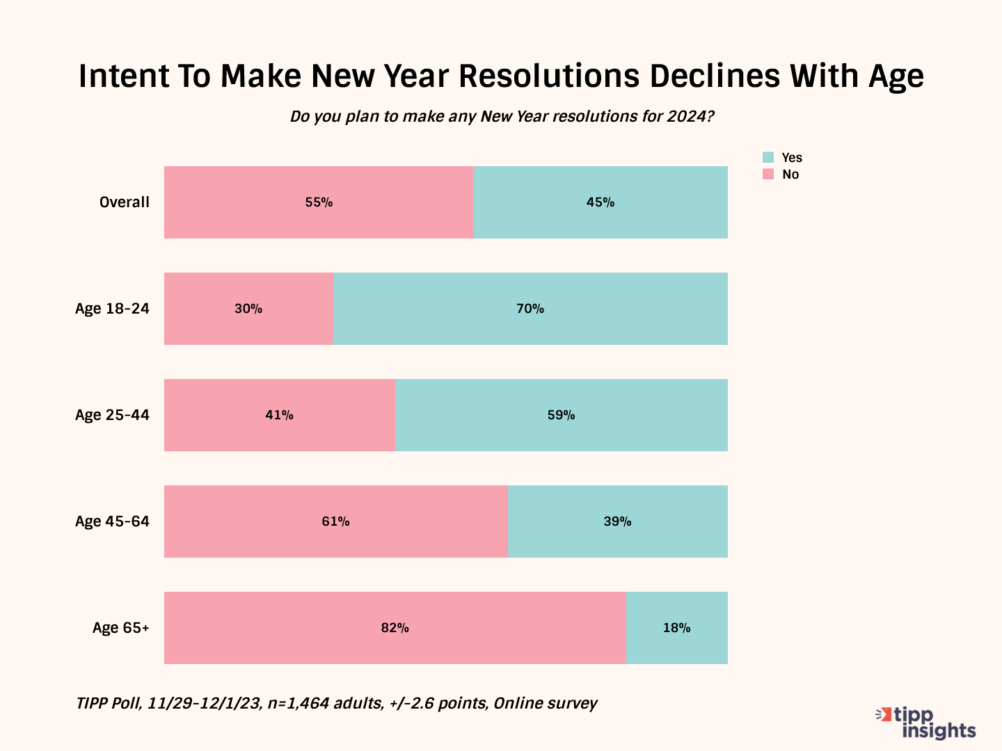 Whatever the origins, people have been making pledges and promises to turn over a new year and be a better version of themselves starting in January. As many make the most of the last few days of the year to indulge and make merry, the TIPP Poll asked close to 1500 Americans, "Do you plan to make any New Year resolutions for 2024?" Surprisingly, less than half, 45%, answered in the affirmative. A majority, 55%, were not planning on making resolutions for the coming year.