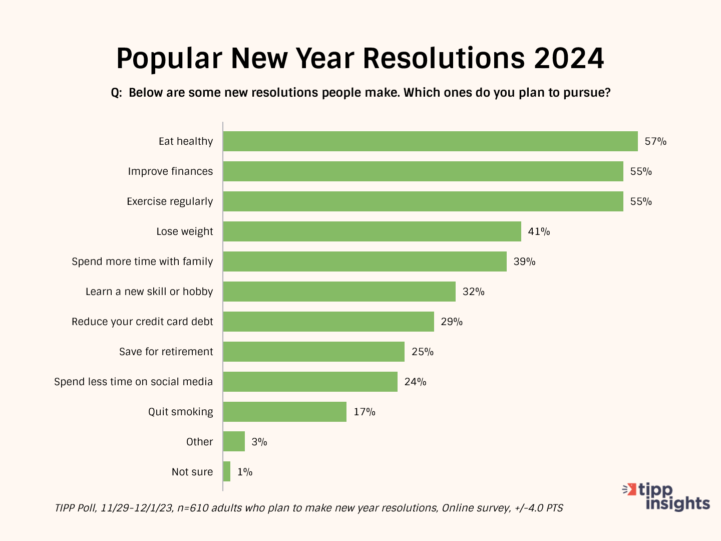 The TIPP Poll asked, "Below are some new resolutions people make. Which ones do you plan to pursue?" The survey found that a healthy lifestyle and finances are the top picks for most Americans. About a quarter want to spend less time on social media, and close to a fifth want to quit smoking.
