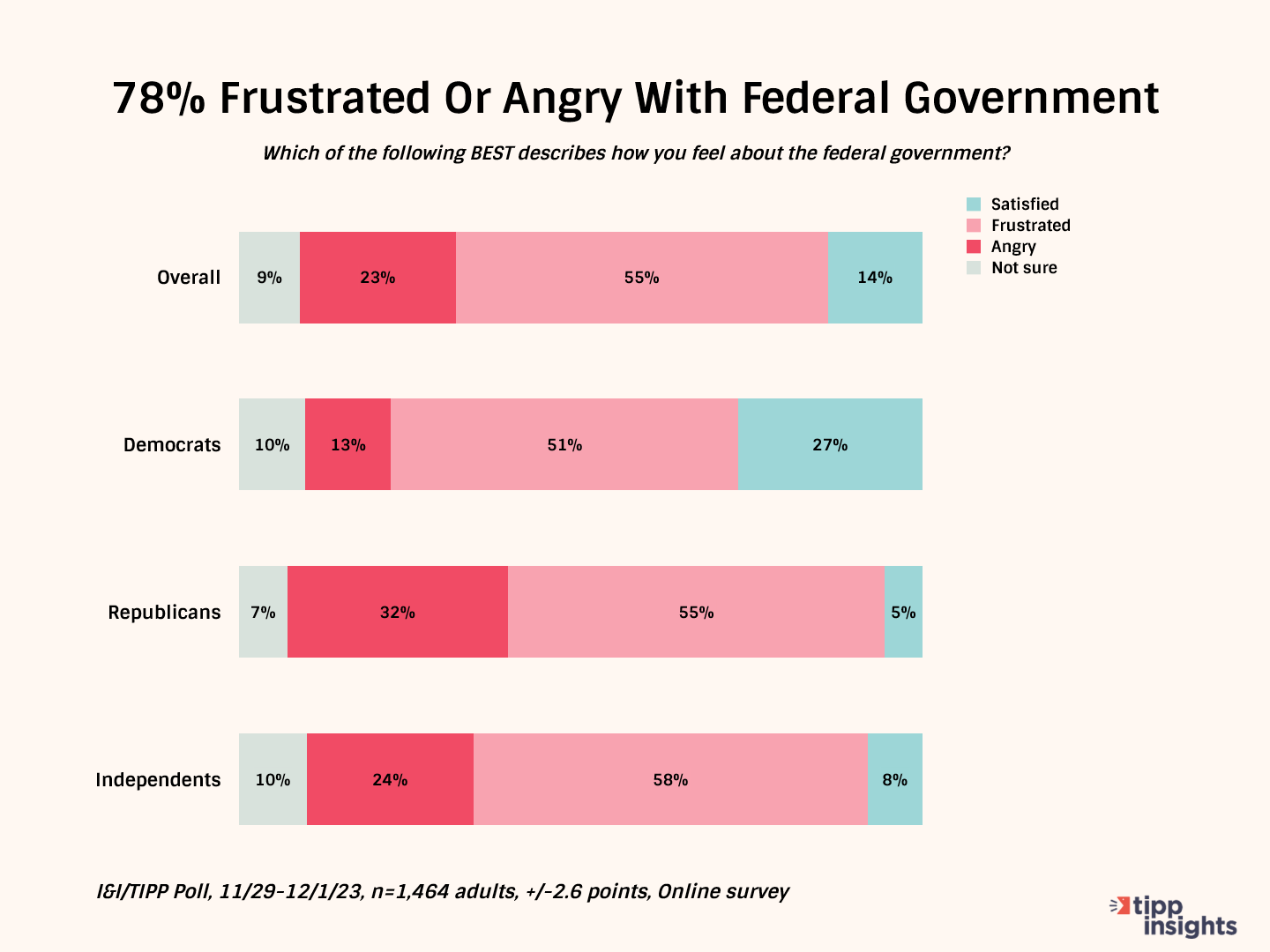 “Satisfied” never had a chance. Overall, just 14% said they were satisfied with Washington. A shocking 55% called themselves frustrated, and another 23% said they were angry, for a total of 78% of all responses.
