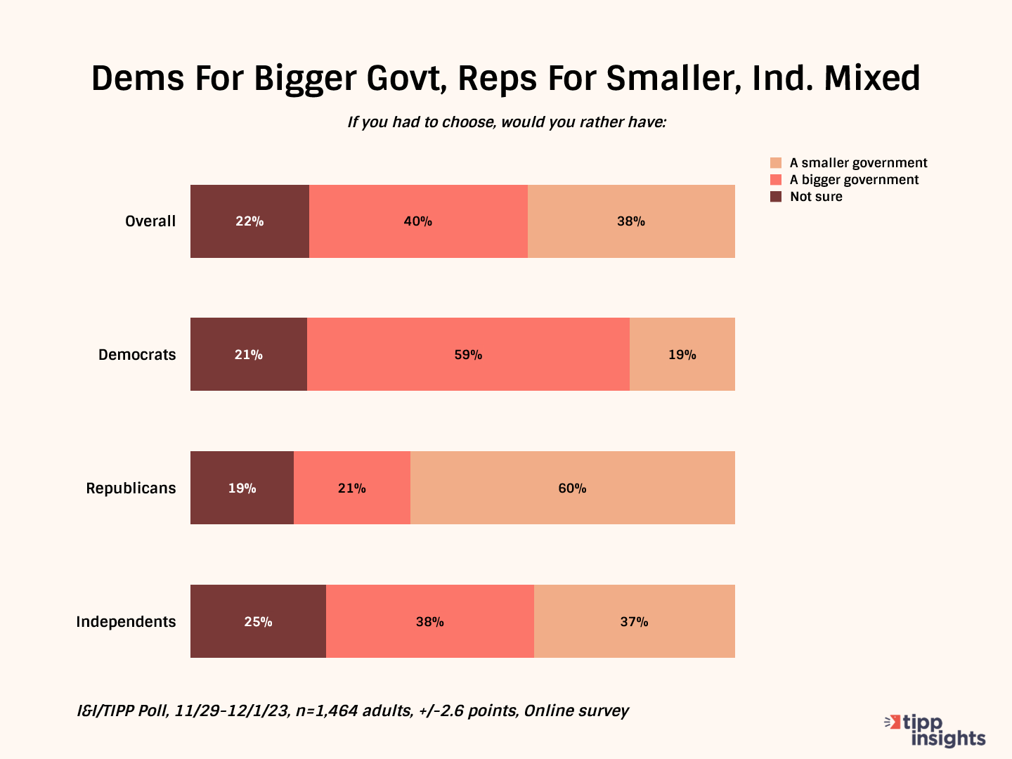 In a follow-on question, I&I/TIPP asked respondents which would they prefer: “A smaller government providing fewer services,” or “A bigger government providing more services,” or “not sure.”