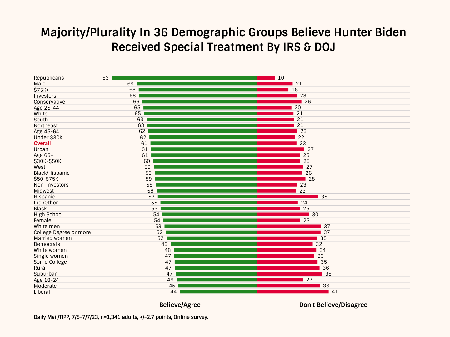 An overwhelming 83 percent of Republicans said the younger Biden had received special treatment, but importantly, about half of supporters of the president's own Democratic Party felt the same way.