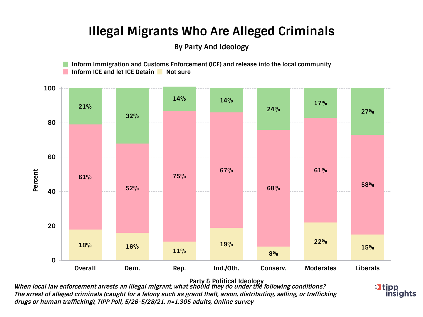 Americans prefer a stricter approach when arresting alleged criminals and a slightly softer approach when arresting migrants who are here illegally but have not engaged in criminal activity, according to a survey by TechnoMetrica's TIPP Poll for the National Sheriffs’ Association, completed recently.