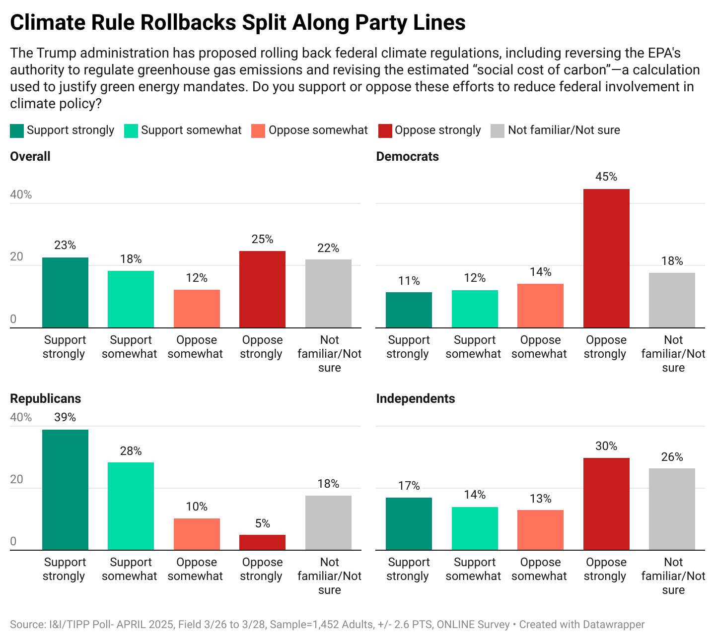“The Trump administration has proposed rolling back federal climate regulations, including reversing the EPA’s authority to regulate greenhouse gas emissions and revising the estimated “social cost of carbon” — a calculation used to justify green energy mandates. Do you support or oppose these efforts to reduce federal involvement in climate policy?”