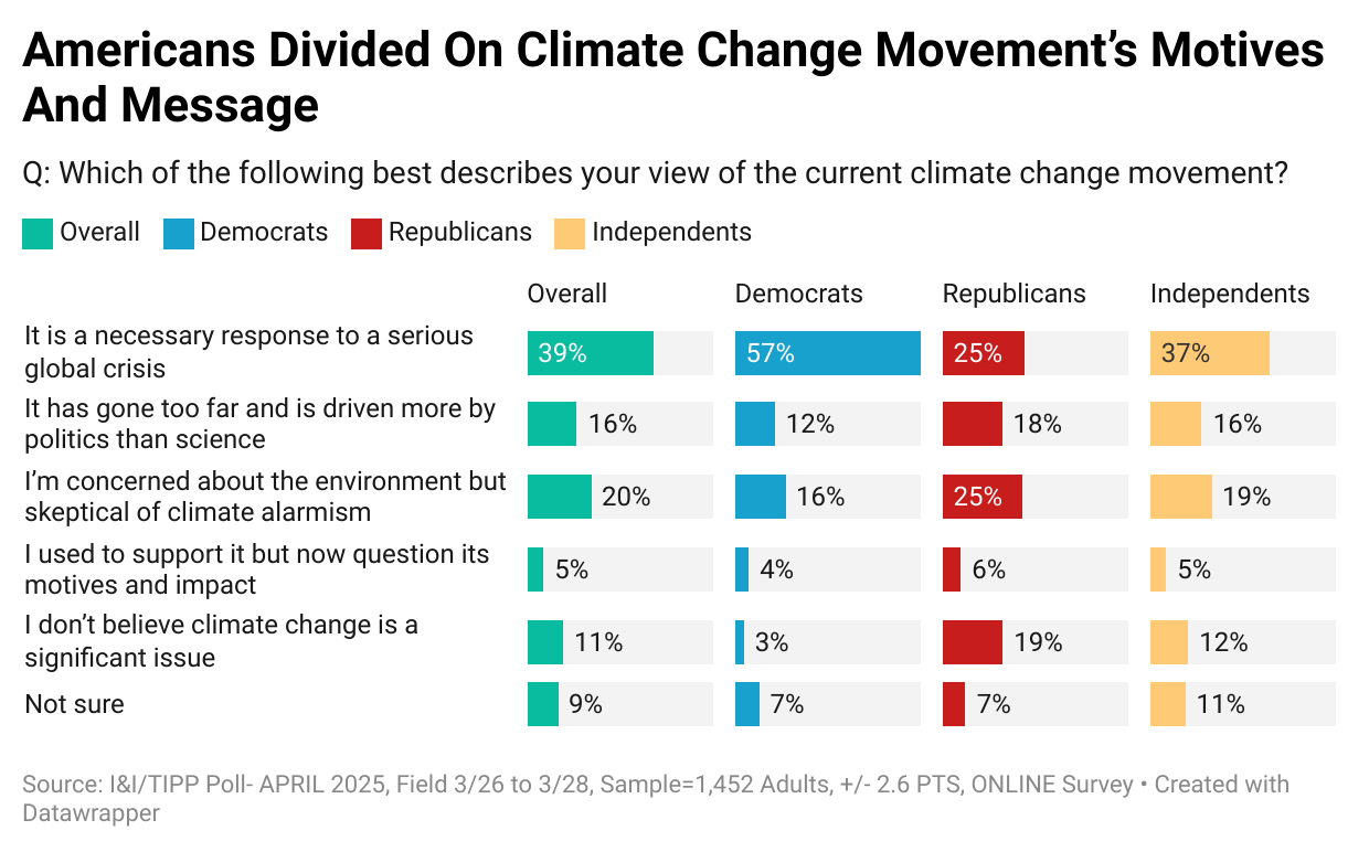 In its national online poll taken Mar. 26-28, I&I/TIPP asked 1,452 poll respondents the following opening question: “Which of the following best describes your view of the current climate change movement?”