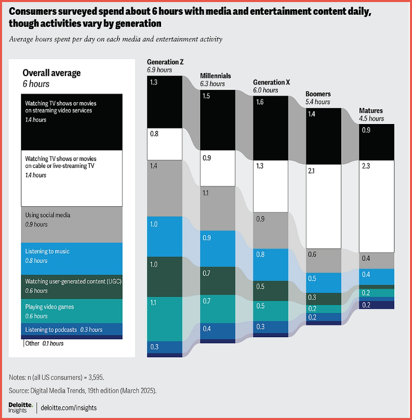 Americans spend about six hours per day consuming media, but how that time is used varies widely. Younger generations spend more time on social media and streaming, while older groups devote more time to traditional TV.