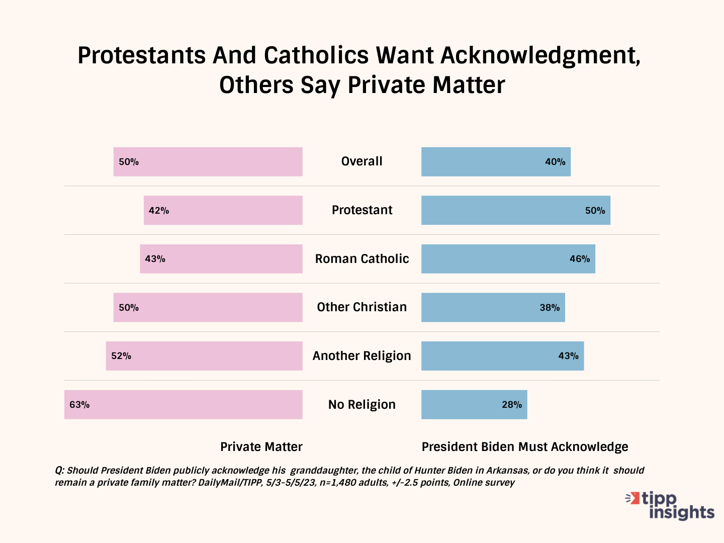 But attitudes are partisan. Nearly two thirds of conservatives say Biden should acknowledge the child's bloodline. So do half of the country's Protestants, as well as those who are parents themselves.