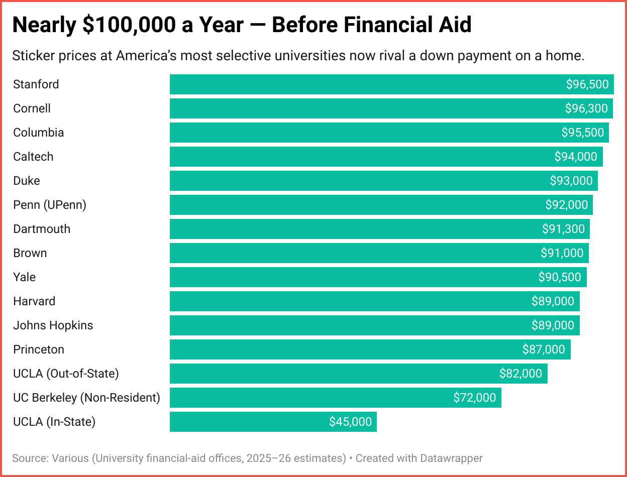 At America’s most selective universities, annual sticker prices now cluster near $100,000 per year before financial aid.