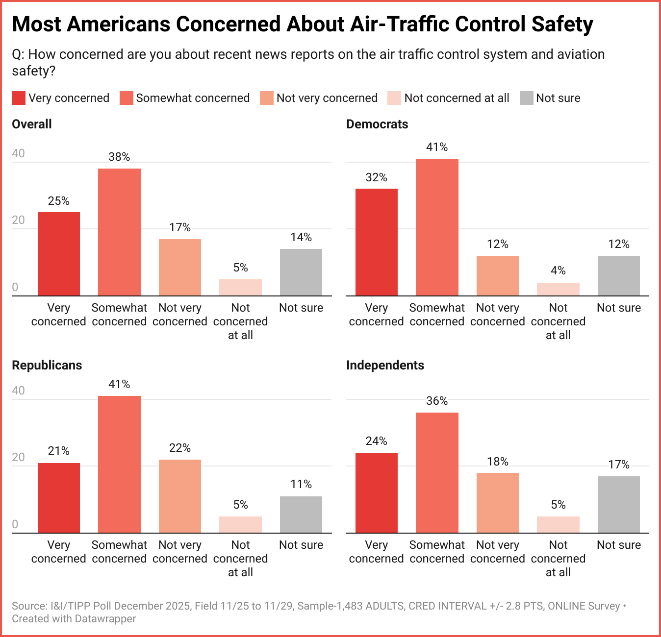 The second question I&I/TIPP posed about air travel was closely related to the first: “How concerned are you about recent news reports on the air-traffic control system and aviation safety?”