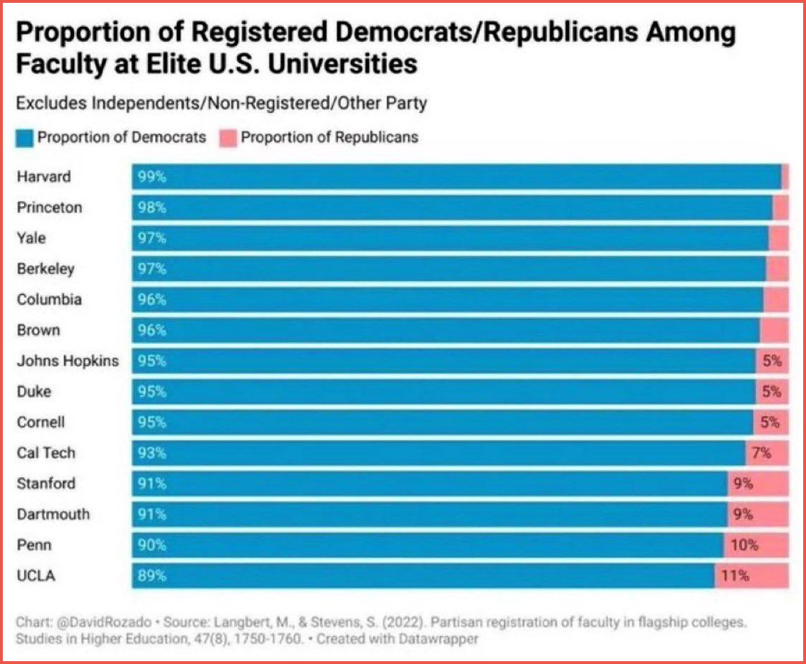 Registration data show Democrats dominate faculty at America’s most elite universities, often accounting for more than 95% of registered partisans, a pattern critics say mirrors the political imbalance reported inside public-media newsrooms.