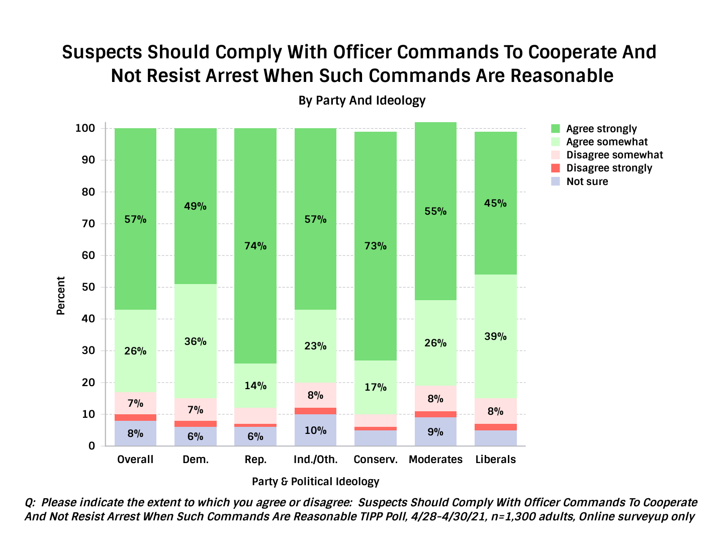 Whether they think the country is united or divided, Americans agree on one thing.  Suspects should comply with officer commands and cooperate, not resist arrest, when such commands are reasonable.  A whopping 83% of Americans think so in a TIPP Poll conducted in late April. While 57% agree strongly and another 26% agree somewhat.