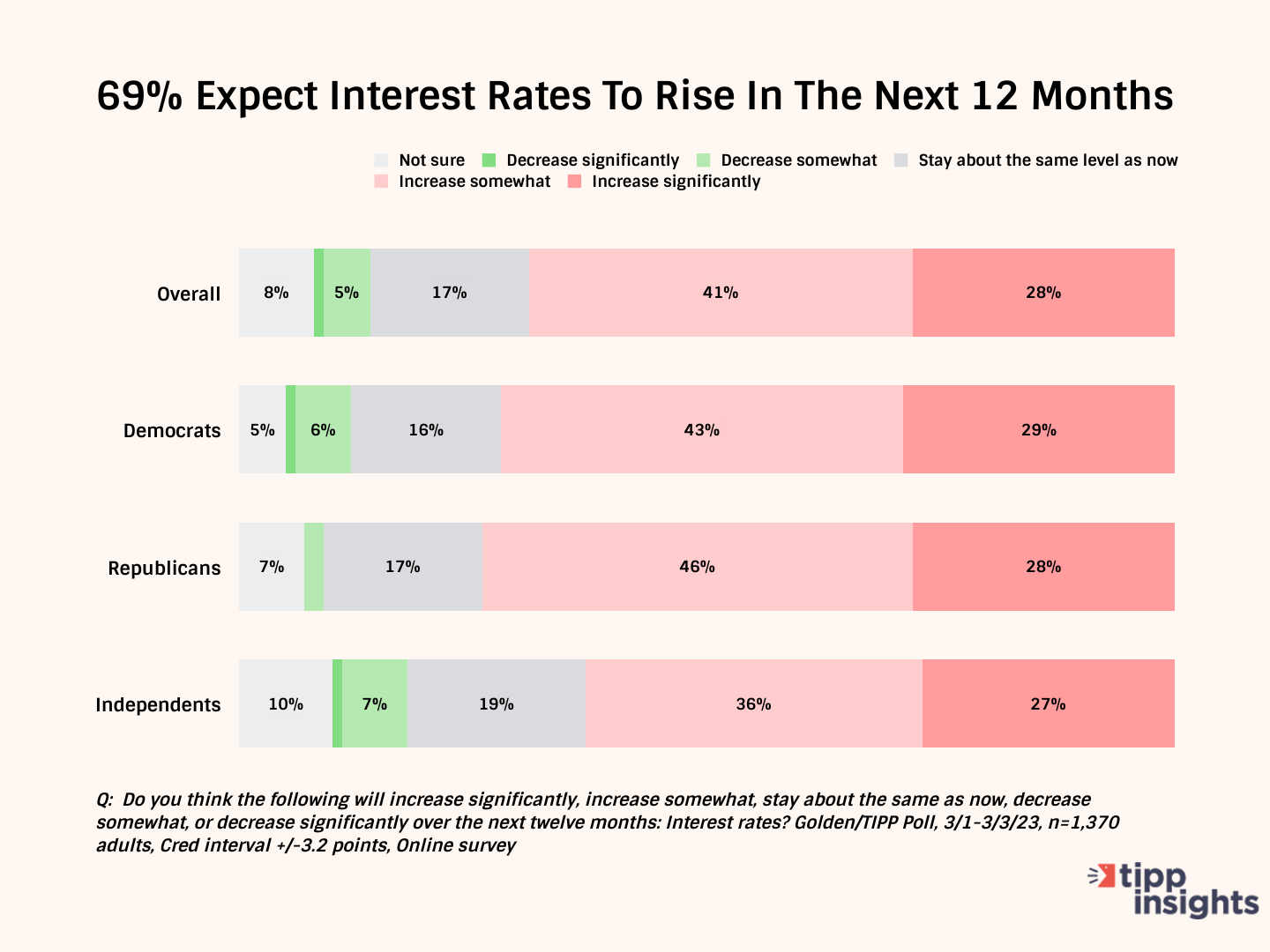 Over two-thirds expect interest rates to rise in the next 12 months. While 28% expect interest rates to increase significantly, 41% think they will increase somewhat. 72% of Democrats, 74% of Republicans, and 63% of independents share the opinion.