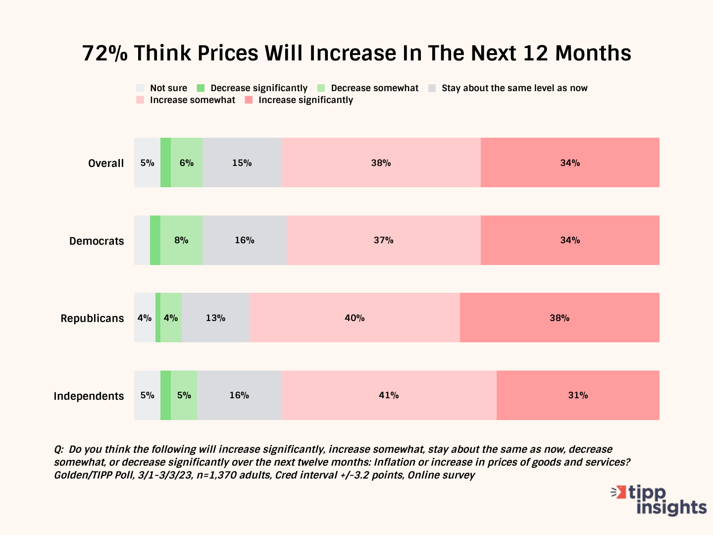 Seventy-two percent of those who participated in the survey think prices will increase in the next 12 months. While 34% believe prices will increase significantly, a similar share of 38% say it will increase somewhat. 71% of Democrats, 78% of Republicans, and 72% of independents expect to pay more.