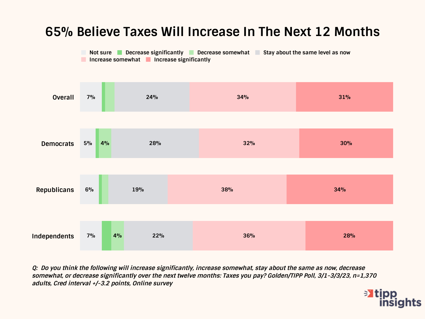 Taxes are mother’s milk for Washington. Nearly two-thirds (65%) expect taxes to increase in the next 12 months. A majority from all political stripes: 62% of Democrats, 72% of Republicans, and 64% of independents anticipate tax hikes.