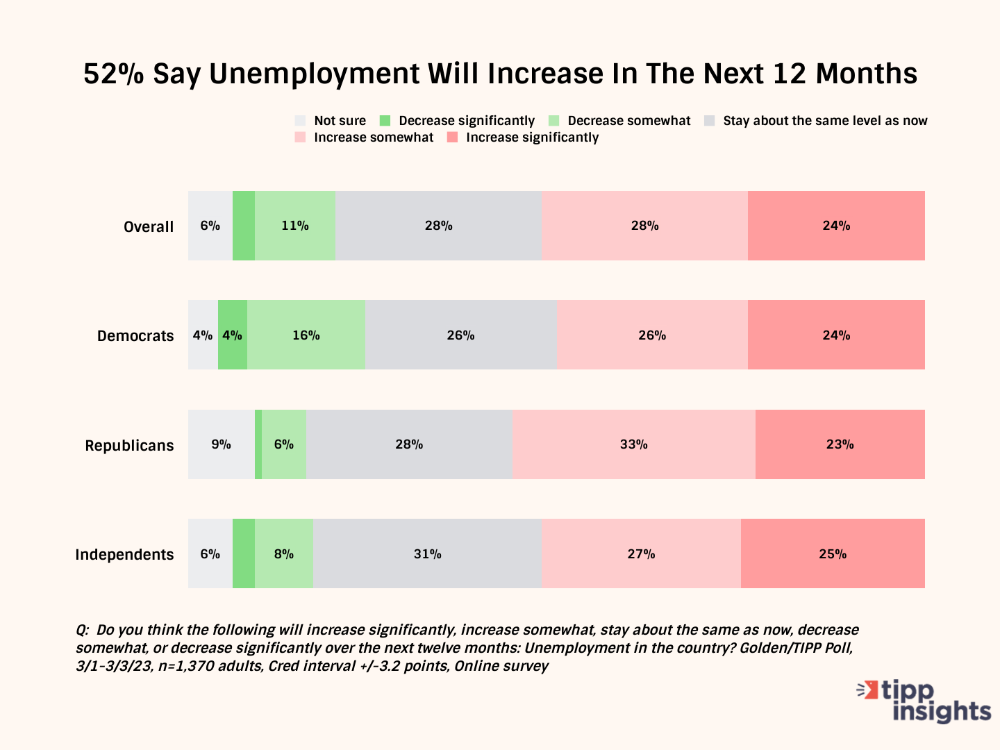Over one in two (52%) believe unemployment will increase in the next 12 months, including 50% of Democrats, 56% of Republicans, and 52% of independents.