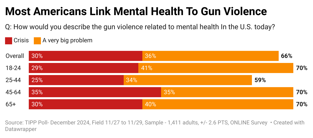 People suffering from severe mental health issues often resort to self-harm or violence against others due to their impaired judgment. Many attribute the rise in violent gun crimes to the prevalent mental health crises. Over two-thirds (66%) of the TIPP Poll participants see it as a crisis or a very big problem.