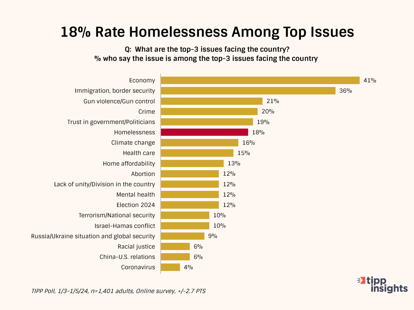 The TIPP Poll collates a list of about 20 issues facing the nation each month and asks Americans to pick what they think are the top 3 issues facing the country. Homelessness has gained importance over the past year.