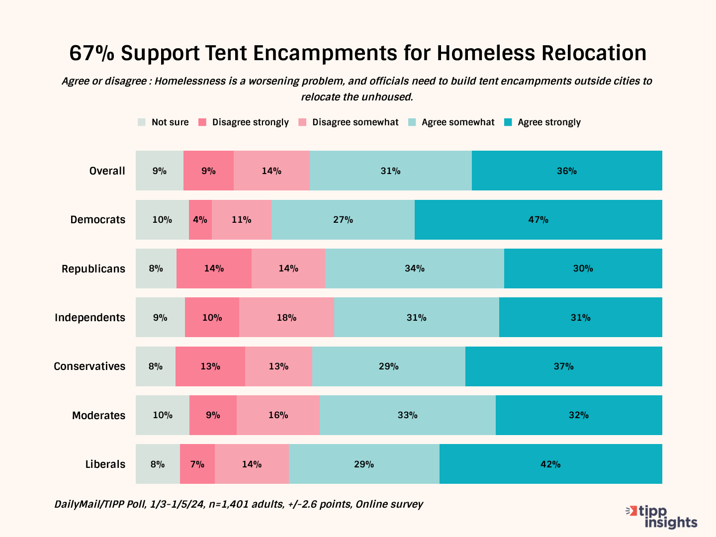The poll also shows that younger people are more likely to support relocating the homeless, with support rates of 78% among ages 18–24, 79% among ages 25–44, 62% in the age 45–64 bracket, and 51% among the age 65+ group.