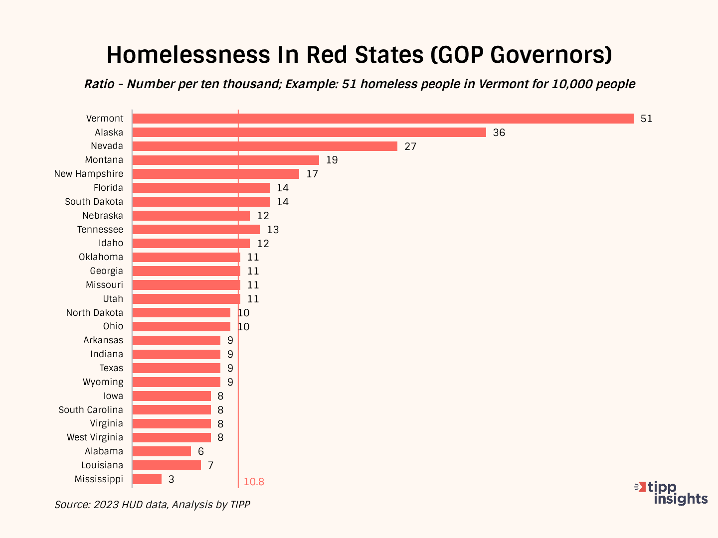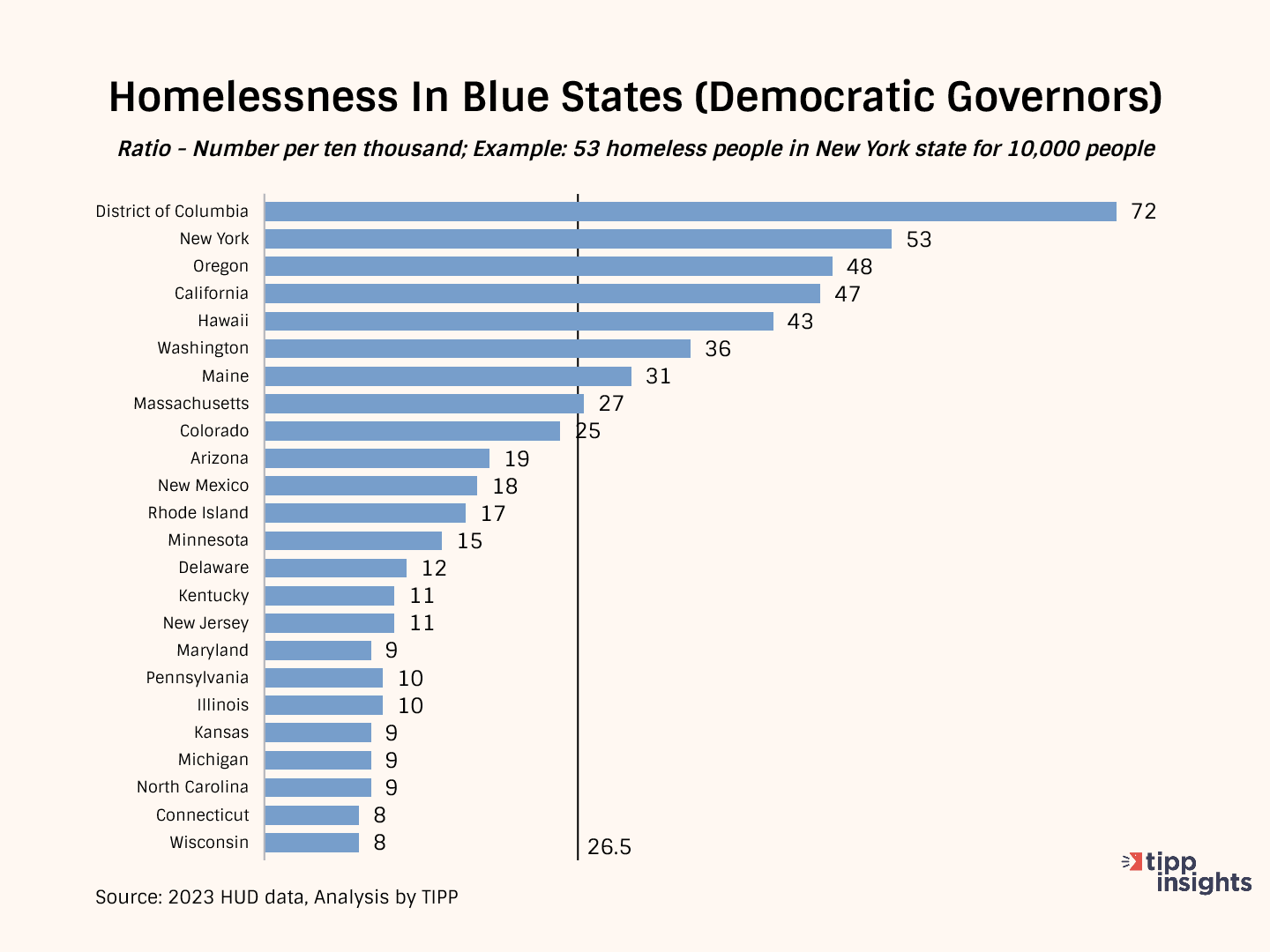 The overall homelessness rate for the nation is 19.4 per 10,000 people. However, it spikes to 26.5 in blue states, nearly 2.5 times the rate of 10.8 in red states. This increase could be because Democratic states like New York and California, which tend to have large urban areas, attract homeless individuals. Further, policy differences and governing approaches may also play a role.
