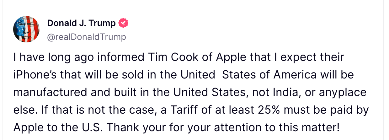 President Trump on Friday demanded Apple manufacture iPhones in the United States or face a 25% tariff. In a Truth Social post, Trump said he warned CEO Tim Cook that iPhones sold in the U.S. must be “built in the United States, not India,” or Apple would pay.
