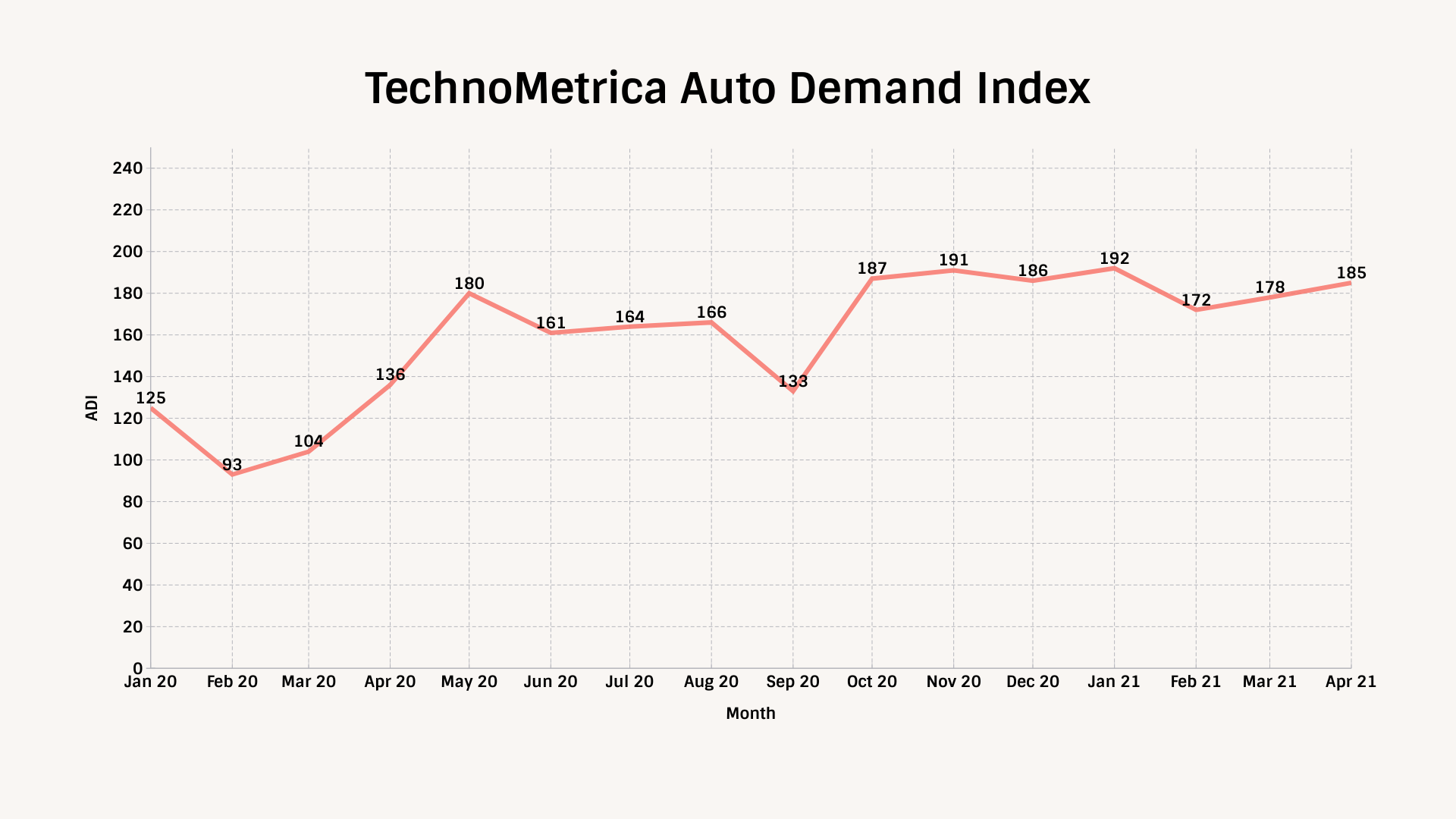 The TechnoMetrica Auto Demand Index (ADI) increased by 7-points, or 3.5 percent, to 185 in April, for the second month in a row.