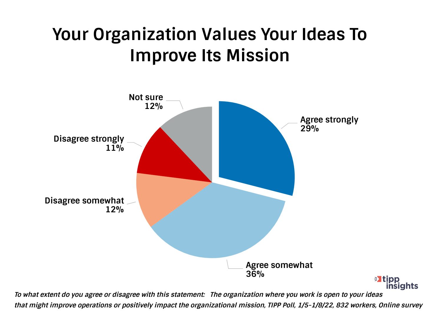 To address this, we asked the TIPP Poll respondents if they felt their ideas were being listened to at work. We found that a majority, or 65% of those polled, believe that the organizations where they work are open to their ideas in that their ideas might improve the operations or positively impact the organization's mission. Of the 65%, 29% strongly agree, and 36% somewhat agree. When examining more closely, of the 23% who disagree, it appears that they are either 18 to 24 years old or over 65 years old, make under $30,000 or make between $50,000 to $75,000 per year.