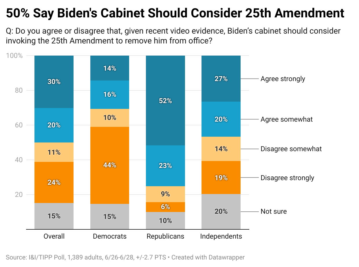 With this possibility in mind, I&I/TIPP asked the following: "Given recent video evidence, do you think Biden’s cabinet should consider invoking the 25th Amendment to remove him from office?" The possible responses given were "yes," "no" and "not sure."