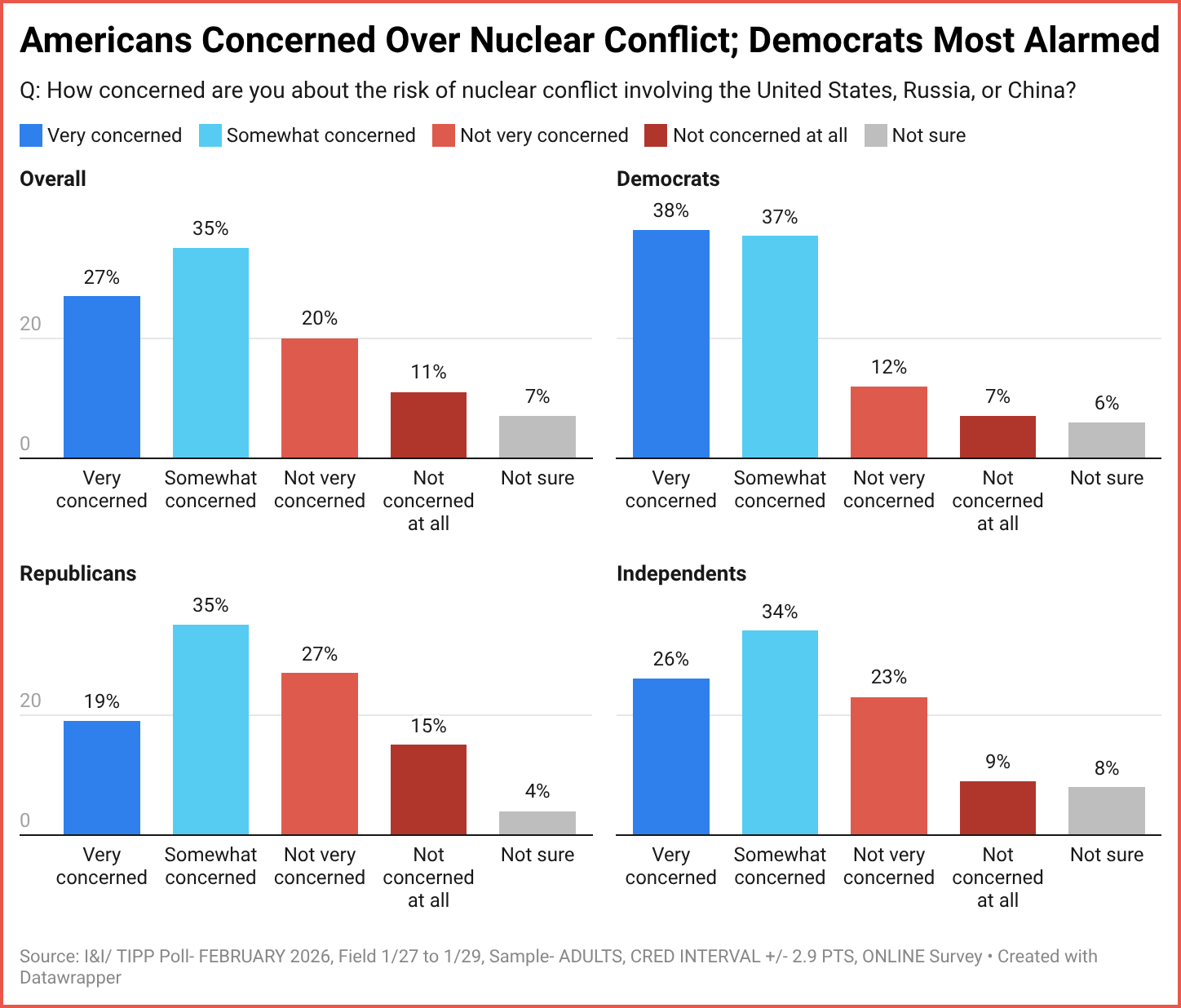 For the February poll, I&I/TIPP asked four questions related to the nuclear threat. The first asked: “How concerned are you about the risk of nuclear conflict involving the United States, Russia, or China?”