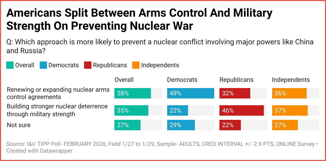Of the answers offered, “Renewing or expanding nuclear arms control agreements” garnered 38% support, with “Building stronger nuclear deterrence through military strength” not far beyond at 35%.