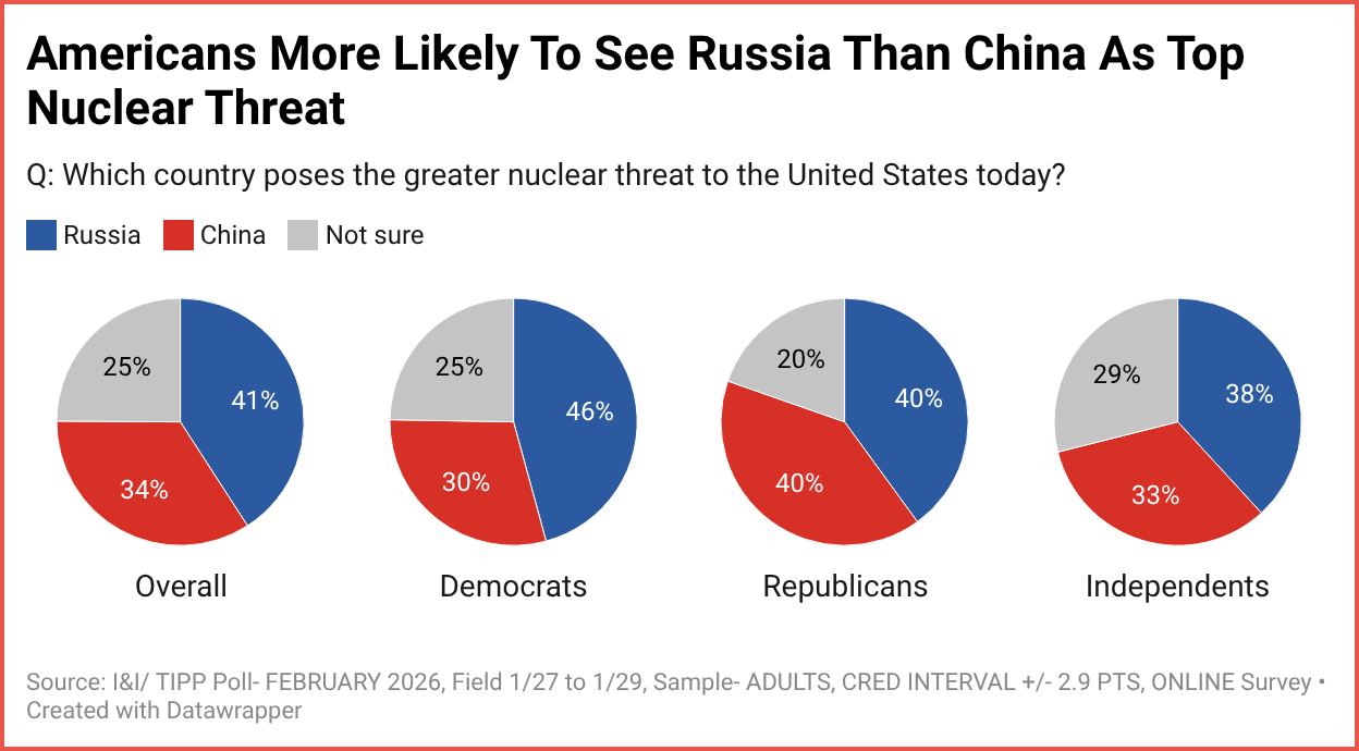 Taking the topic a step further, I&I/TIPP asked: “Which country poses the greater nuclear threat to the United States today?” Those answering were given three possible responses: Russia (41%), China (34%), and “not sure” (25%).
