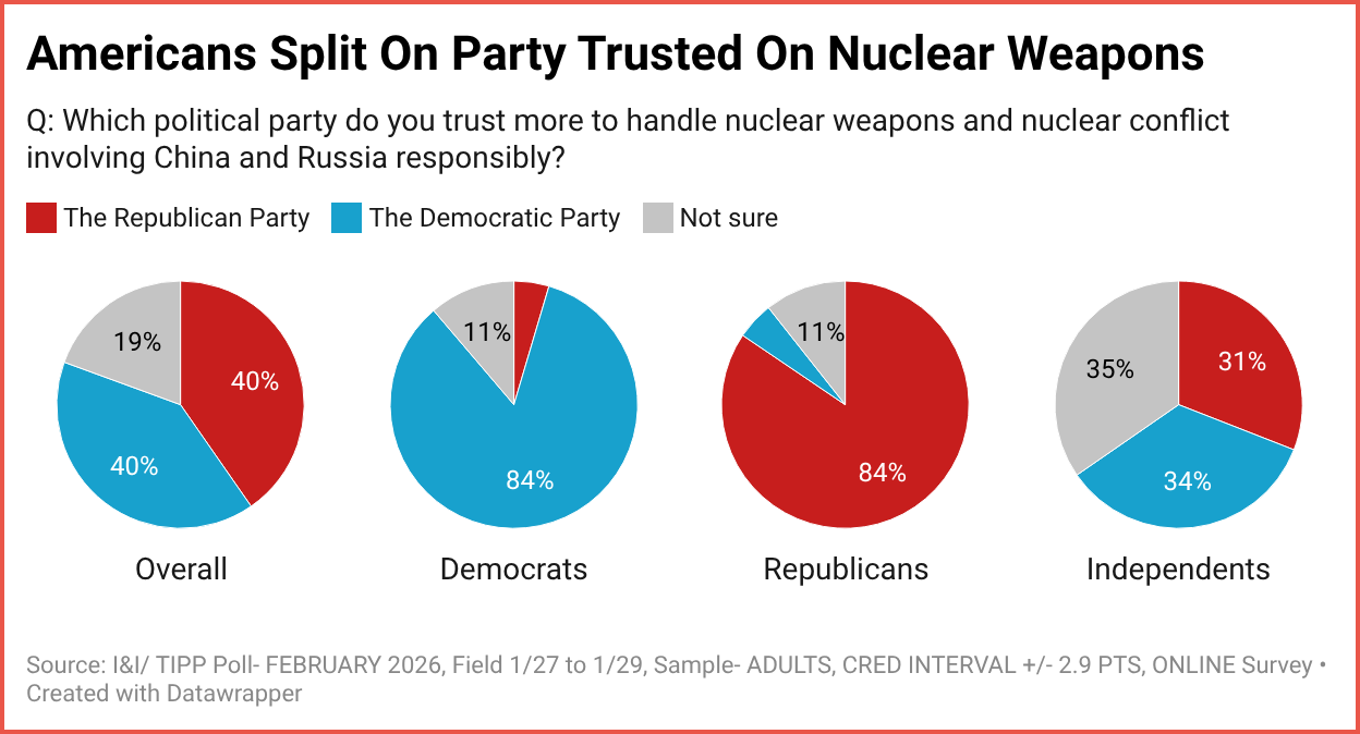 Among independents, 34% preferred Democrats, while 31% preferred Republicans to handle the nuclear issue. But a sizeable 35% weren’t sure.