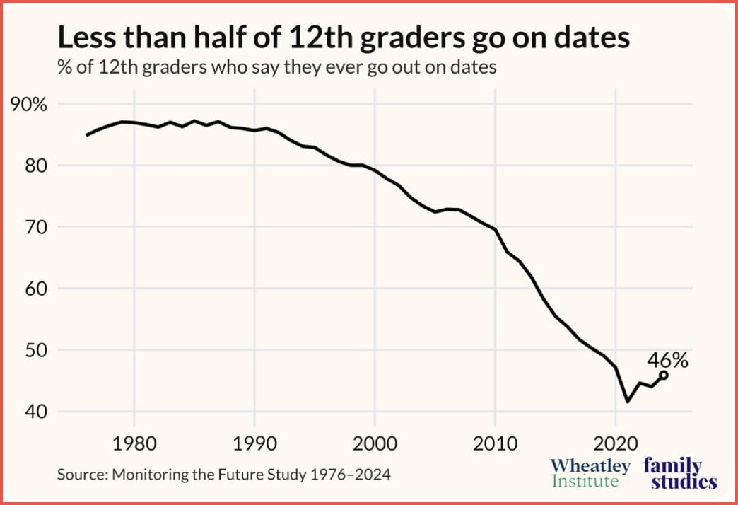 Less than half of U.S. high school seniors now report going on dates, down sharply from past decades when dating was the norm. The share of teens who date has fallen steadily since the 1980s.