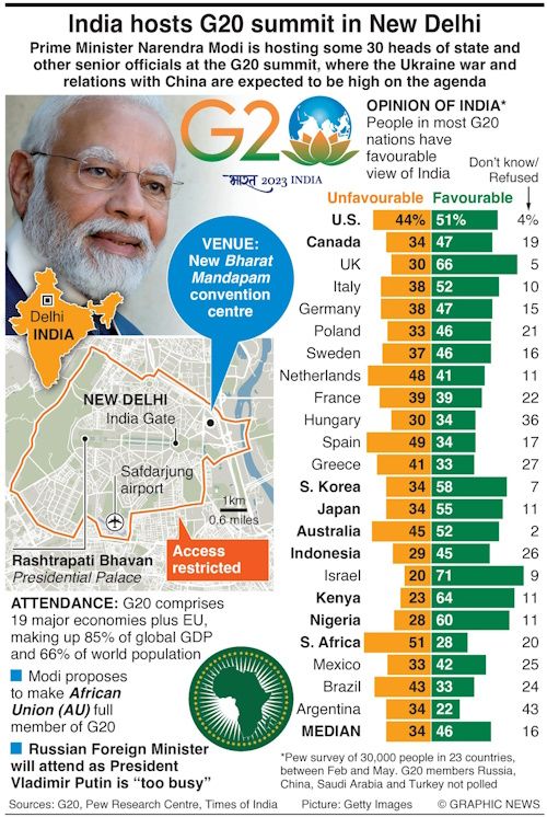 - G21 leaders met in New Delhi to address global issues, including sustainability, environment, taxation, money laundering, and terrorism, without condemning Russia's actions in Ukraine